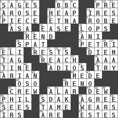 ACROSS 1. Gurus 6. English channel? 9. Before (prefix) 12. Came up 13. Pile 14. Angers 15. Component 16. Inactive volcano in Sicily 17. Loose flowing garment 18. White ___ sheet 19. Comfort 20. Chops off 21. Tear apart 23. Cuckoo 24. Petty quarrel 25. _ dish (used to culture cells) 28. Connecticut Ivy Leaguer 30. Musical pauses 34. South Vietnam president (1954) 35. Label 36. Arrive at 38. Auto club (abbr.) 39. Prong on a fork 41. Goodbye (Sp.) 43. Attempt to accomplish something 44. Believer in; advocate of (suffix) 46. Ancient Persian 48. Bear (Spanish) 49. Western Nevada city 50. Ship's personnel 51. Having or resembling wings 53. Morning condensation 56. Silvers or Donahue 57. Neighbor of Neb. 58. Match 60. Perceives with the eye 61. Docile 62. Puts on (as clothing) 63. Big collection agency 64. "We ___ not amused" (Victoria) 65. _____ Park, CO DOWN 1. Plant excrement 2. Operatic vocal solo 3. Leaves 4. Fortification 5. Observe 6. Wagers 7. Object of repulsion 8. Accounting whiz (abbr.) 9. Appease 10. Confederate soldiers (slang) 11. Compass dir. 13. Froth on beer 14. Pressed 19. Keyboard key 20. Pet locale 22. Ewer handle 24. Seigniories (variant) 26. Rump 27. "If ____ say so..." 28. Singer James 29. Den 31. Ocean 32. Small amount or degree 33. _-fi 37. Home run 40. Artist's stands 42. Elected rep. 45. At this time 47. Evades 49. Immoral or dissolute person 50. "Mermaids" star 51. The sixth month of the Jewish calendar 52. Unable to walk 54. Part of Q.E.F. 55. We are 56. 23rd letter of the Greek alphabet 57. R.R. building 58. Deep reverence 59. Double-curved letter