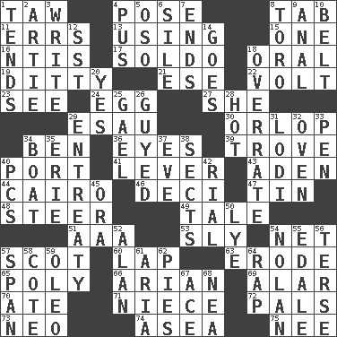 ACROSS 1. The 23rd letter of the Hebrew alphabet 4. Airs 8. Keyboard key 11. Blunders 13. Exploiting 15. Single 16. Nuclear Threat Initiatives 17. Twentieth part of a lira 18. Taken by mouth 19. Short, simple song 21. Compass dir. 22. Electrical Unit 23. Perceive with the eye 24. Oval reproductive body of a fowl 27. A female animal or person 29. Son of Isaac 30. Lowest deck of a ship 34. Benjamin's nick name 36. Snake ____ (dice throw) 39. Collection of objects 40. Left side of a ship or aircraft 41. Crowbar 43. An important port of Yemen 44. Capital of Egypt 46. Tenth: prefix 47. Shallow baking pan 48. Bull 49. Story 51. American Automobile Association (abbr.) 53. Playfully artful 54. Fish or hair follower 57. Highlander 60. Pet locale 63. Eat (away) 65. Many (prefix) 66. Believer in; advocate of (suffix) 69. Having or resembling wings 70. Had dinner 71. Sibling's daughter 72. Friends 73. Modern: prefix 74. Toward the sea 75. Born DOWN 1. Looks after 2. Nick name for Arthur 3. Compose 4. Ichor 5. Bear (Spanish) 6. Drop; flow; fall 7. Conclusions 8. "Corrida" creature 9. Of or related to the anus 10. Waist strap 12. Fast jet (abbr.) 14. Travels 18. Make much ado about nothing 20. Affirmative reply 25. Highlander 26. Ridiculed 28. Being at a high temperature 29. Plea 31. Farming town in central California 32. Baking chamber 33. Fenced enclosure 34. Water vessel 35. One of the Great Lakes 37. Night before a holiday 38. Religious groups 40. Personal Computers (abbr.) 42. Monetary unit of Yemen 45. Mouth or opening 50. Potassium hydroxide 52. Actor Alda or Thicke 54. Pitcher Ryan 55. Peak District village in England 56. Laconic 57. Connect, as a bridge 58. ____ d'Azur (French Riviera) 59. Margarine 61. Roberta Peters solo 62. Sliced desserts 64. Strike 67. Adept person 68. Teachers' org.