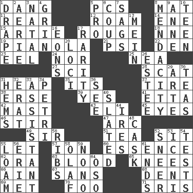 ACROSS 1. Mild oath, euphamism for damn 5. Personal Computers (abbr.) 8. Floor protector 11. Posterior 12. Wander aimlessly 14. Compass dir. 15. Nick name for Arthur 17. Makeup applied to the cheeks 18. Compass dir. 19. Player piano 21. 23rd letter of the Greek alphabet 22. Lair 23. Snakelike fish 24. Not either 25. Teachers' org. 27. _-fi 28. Leave at once 31. Pile 35. ___ a Wonderful Life 37. Hoop that covers a wheel 38. Celtic language 39. Affirmative reply 41. Singer James 42. Vertical spar for supporting sails 43. Connecticut Ivy Leaguer 45. Sight organs 46. Use a spoon 47. Curve 49. Title for a knight 51. Afternoon social gathering 52. Be seated 55. Allow 57. Electrically charged atom 60. Core 62. Mouth or opening 63. Vital fluid 65. Leg joints 66. The 18th letter of the Arabic alphabet 67. Without 68. Gouge 69. Was introduced to 70. Egg _ yung 71. Indian titles of respect DOWN 1. Window treatment 2. Nest on high 3. Relating to or accompanying birth 4. Smile widely 5. Adept person 6. Clever action or accomplishment 7. Settles 8. Ananias' fault 9. Singer Murray 10. Adolescent 13. Chow _ 16. Immeasurably long periods of time 17. Noteworthy scarcity 20. Event scenes 26. First name in cosmetics 29. Johnson of "Laugh-In" 30. Beverages made from leaves 31. Folds over and sews together 32. Part of Q.E.F. 33. Helper 34. _ dish (used to culture cells) 36. Perceive with the eye 40. Scheduled 44. Angers 48. Keg 50. Teases 52. Contemptuous expression 53. Ancient Celtic tribe of eastern Britain 54. Trials 55. Rich soil 56. 4th largest of the Great Lakes 58. Norwegian king 59. Words to Nanette 61. Conclusions 64. Bear (Spanish)