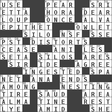 ACROSS 1. Purpose 4. Lightbulb-shaped fruit 8. _ Lanka 11. Singer James 13. Israeli folk dance 14. Letter starter 15. Central Nebraska county 16. Single time 17. Inventor's middle name 18. Curse 21. A small or young owl 22. Grain storage tower 23. Overdraft (abbr.) 25. Compass dir. 26. Pacific Standard Time (abbr.) 29. What propaganda does 32. Desist 34. Black tropical American cuckoo 35. French article 38. Stalk of a moss capsule 39. Grain storage towers 41. Ancient Greek god of war 43. Title for a knight 44. Binary compound 45. Match 46. Eaten 50. Health resort 51. Fish or hair follower 54. Santa ___, CA 55. Extremities 57. Amid 59. Snuggling 63. Become fatigued 64. Saudi Arabian king (1953-1964) 67. Length times width 68. _ mater 69. Prong on a fork 70. Take ten 71. Potassium hydroxide 72. Among 73. A female animal or person DOWN 1. Ubangi River tributary 2. Cease 3. Needle case 4. Pictures 5. Age 6. Curve 7. Actress Charlotte 8. Exchanges for money 9. All-night dance parties 10. Feeling or showing extreme anger 12. Tenement units (abbr.) 14. Simpleton 19. Flintstone garb 20. Biblical high priest 21. Often (poetically) 23. Words to Nanette 24. Indian titles of respect 26. Personal Computers (abbr.) 27. Observes 28. Jacques of French films 30. Falsehoods 31. Volcanic refuse 33. Indian skirt 36. Blunders 37. Ooze 39. Signal 40. It may be bright or harebrained 42. Ocean 45. Sums up 47. Tired old horse 48. Looked after 49. Compass dir. 51. Brizilian seaport 52. Poet Dickinson 53. Singer Mel 56. Play the lead 58. Teachers' org. 60. Angers 61. Tender 62. Yard entry 64. R.R. building 65. Direct toward a target or goal 66. Corn or form start