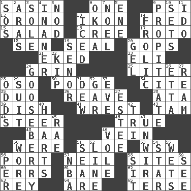 ACROSS 1. Indian antelope 6. Single 9. Air pressure measure (abbr.) 12. U. of Maine site 13. Picture 14. Flintstone 15. First course 16. Algonquian 17. Printing process, for short 18. Elected rep. 19. Lick closed 20. Republicans 21. Supplemented with great effort 23. Connecticut Ivy Leaguer 24. Broad smile 25. 61 cubic inches 28. Bear (Spanish) 30. Plash 34. Quote 35. Superhero pair 36. Break or tear apart 38. "One Day ___ Time" 39. Food container 41. Take or capture by force 43. Scottish cap 44. Navigate 46. Loyal 48. Sound made by sheep 49. Distinctive style or manner 50. Past tense of be (plural) 51. A type of plum 53. Compass dir. 56. Sweet dark-red dessert wine 57. Famous astronaut Armstrong 58. Locates 60. Blunders 61. Object of repulsion 62. Feeling or showing extreme anger 63. Marina Del _, California 64. "We ___ not amused" (Victoria) 65. Laconic DOWN 1. Distress signal 2. Caspian sea tributary 3. Not divided or shared with others 4. More empty; more void 5. Lower and raise head in agreement 6. Gumbo ingredient 7. Christmas carol 8. Compass dir. 9. Conciliate 10. Arranges properly for use 11. Wedding promise 13. On the rocks 14. Play 19. Sir (Sp.) 20. Set 22. Monetary unit of Laos 24. Sour, prickly fruit 26. Singer James 27. 480, 500 or 516 sheets of paper 28. Probability 29. Set of matching outer garments 31. Morning condensation 32. Slender fish 33. First lady 37. First name in cosmetics 40. Centers of feelings and intuitions 42. Three (prefix) 45. Actress Charlotte 47. Undo the wiring of 49. Grand slam 50. Had on 51. Wither 52. Actor's bit 54. Play the lead 55. Soaks 56. For each 57. Basketball assoc. 58. Be seated 59. Perceive with the eye
