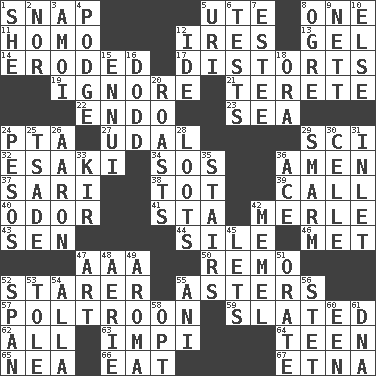 ACROSS 1. Fastener 5. Shoshoni 8. Single 11. Like (prefix) 12. Angers 13. Set 14. Worn away 17. What propaganda does 19. Dismiss 21. Cylindrical with tapered ends 22. Inside; within (prefix) 23. Ocean 24. Parent Teacher Association (abbr.) 27. Freehold land 29. _-fi 32. 1973 Nobel Price Winner (Physics) Leo 34. Distress signal 36. So be it 37. Indian skirt 38. Small child 39. Give a ring to 40. Scent 41. R.R. building 42. Haggard of country music 43. Elected rep. 44. Drop; flow; fall 46. Was introduced to 47. American Automobile Association (abbr.) 50. San ____ (Riviera town) 52. A viewer who gazes fixedly 55. Michaelmas daisies 57. Characterized by complete cowardliness 59. Scheduled 62. 100% 63. Body of Kaffir warriors 64. Adolescent 65. Teachers' org. 66. Consume 67. Inactive volcano in Sicily DOWN 1. A female animal or person 2. Not either 3. Mine, in Marseilles 4. Plash 5. RI univ. 6. Trials 7. First name in cosmetics 8. Legendary monster 9. Remaining after all deductions 10. Otherwise 12. Binary compound 15. World-weariness 16. Texas town _ City 18. Mouth or opening 20. Exposes to great heat 24. Mexican monetary units 25. Sadhe (variant) 26. Composer Copland 28. Plunders 29. Excessive but superficial compliments 30. Cell (Danish) 31. An arm off of a larger body of water 33. Apertif with cassis 35. Flight of steps 36. Adept person 42. Klaipeda city 45. Allows 47. Tate display 48. Nest on high 49. Scent 51. Speak pompously 52. Connect, as a bridge 53. Lacquered or enameled metalware 54. Silent film actress Nazimova 55. Cuckoo 56. Proofreading order 58. Elect 60. Car or cant ending 61. Heredity factor (abbr.)