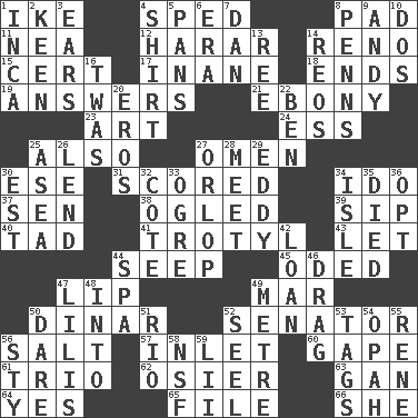 ACROSS 1. Mamie's mate 4. Drove too fast 8. Groovy apt. 11. Teachers' org. 12. Ethiopian city, capital of Harari 14. Former U.S. Attorney General Janet 15. Certainty 17. Silly 18. Extremities 19. Responds (to) 21. Dark wood 23. Nonscientific branch of learning 24. Double-curved letter 25. In addition 27. Presage 30. Compass dir. 31. Tallied 34. Wedding promise 37. Elected rep. 38. Stared 39. Small drink 40. Bit 41. TNT 43. Allow 44. Ooze 45. Wrote a lyric poem 47. Mouth edge 49. Impair 50. Middle Eastern gold or silver currency 52. Elected representative 56. Table seasoning 57. An arm off of a larger body of water 60. Stare wonderingly 61. Musical group of three 62. Flexible twig of a willow tree 63. Separate the seeds from cotton 64. It is so 65. Do some clerical work 66. A female animal or person DOWN 1. South American Indian 2. Peachy ____! 3. Hearing organs 4. Upper-body garment 5. Baking dishes 6. Epoch 7. Daniel's nick name 8. Actor Sean's family 9. Actor Griffith 10. Two (Sp.) 13. To separate or throw off 14. Vintage cars 16. It was, poetically 20. Greek god of love 22. Benjamin's nick name 25. At sea 26. Grant temporary use of 27. Lowest deck of a ship 28. Confront 29. Whirlpool 30. Eastern Standard Time (abbr.) 32. ____ d'Azur (French Riviera) 33. Legendary monster 34. Capri or Wright 35. Passed on 36. Elect 42. Grant temporary use of 44. Health resort 46. To be drawn or hauled along 47. Ms. Damita and namesakes 48. To the inside or interior of 49. Distance measurement (Brit.) 50. Have the gumption 51. River (Sp.) 52. Stitch closed the eyes of (a falcon) 53. Labels 54. Brightly colored fish 55. French philosopher Descartes 56. Filthy place 58. Overdraft (abbr.) 59. Cards in a Roman deck?