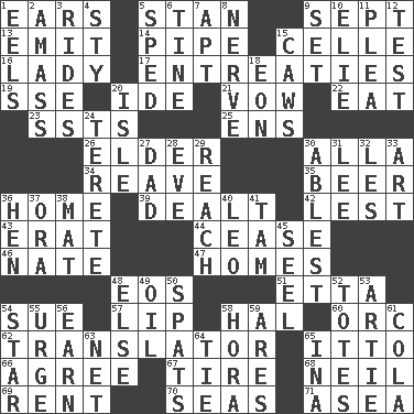 ACROSS 1. Hearing organs 5. Comedian Laurel of Laurel & Hardy 9. Back-to-school mo. 13. Give off 14. Corncob 15. Cell (Danish) 16. Kenny Rogers chart-topper in '80 17. Pleas 19. Compass dir. 20. Binary compound 21. Promise 22. Consume 23. Fast planes 25. Followers of ems 26. A person who is older than you are 30. Silent film actress Nazimova 34. Rob, plunder, or pillage 35. Fermented drink made from hops 36. Residence 39. Started a card game 42. For fear that 43. Part of Q.E.F. 44. Desist 46. Nathan's nickname 47. Dwellings 48. Greek goddess of the dawn 51. Singer James 54. Institute legal proceedings 57. Mouth edge 58. Actor Linden 60. The grampus (Milton) 62. Interpreter 65. "Tell ____ the Marines!" 66. Match 67. Become fatigued 68. Famous astronaut Armstrong 69. Monthly bill 70. Oceans 71. At sea DOWN 1. Snakelike fish 2. Collect or gather 3. Amusement-park features 4. Filthy place 5. Broke a traffic law 6. Prong on a fork 7. Fitting 8. Effrontery 9. Arrange properly for use 10. Writer Wiesel 11. Entreaty 12. Trial 15. Crow sounds 18. Age 20. Small island 24. Cylindrical with tapered ends 27. June honoree 28. Night before a holiday 29. Arrive at 30. Most capable 31. Area sheltered from the wind 32. French article 33. Tate display 36. Layer 37. Mouth or opening 38. Floor covering 40. Lion 41. Scottish cap 45. Stitch closed the eyes of (a falcon) 48. Otherwise 49. Petroleum 50. Arguments over trivial matters 52. Lugs 53. Nick name for Arthur 54. Play the lead 55. Goad 56. Merit 58. Israeli folk dance 59. Ancient Greek god of war 61. Root beer relative 63. Fish or hair follower 64. Standoff 65. _ tizzy (2 wds.)