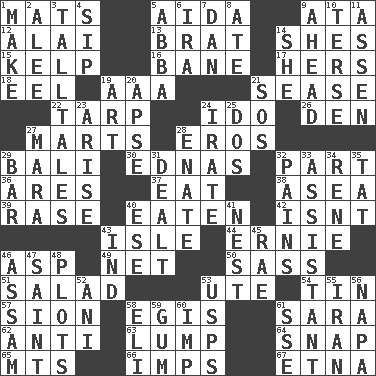 ACROSS 1. Floor protectors 5. Opera by Verdi 9. _ moment's notice (2 wds.) 12. Mountain range southwest of Kyrgyzstan 13. Naughty child 14. "______ My Girl" (Turtles hit) 15. Seaweed 16. Object of repulsion 17. Possessive pronoun 18. Snakelike fish 19. American Automobile Association (abbr.) 21. Gospel singer Marvin 22. Canvas cover 24. Wedding promise 26. Lair 27. Shops 28. Greek god of love 29. Indonesian resort city 30. Ferber et al. 32. Piece 36. Ancient Greek god of war 37. Ingest 38. At sea 39. To erase 40. Ingested 42. Is not 43. Small island 44. Bert's buddy 46. Viper 49. Fish or hair follower 50. Backtalk 51. First course 53. Shoshoni 54. Metal container 57. The Jewish people; Israel 58. Armor plate that protects the chest 61. "Two Mules for Sister ____" 62. Against 63. Mass 64. Fastener 65. Mountains (abbr.) 66. Naughty children 67. Inactive volcano in Sicily DOWN 1. Cause to be 2. Toward shelter 3. Baron Munchausen's specialties 4. Small drink 5. Swedish rock group 6. Lyricist Gershwin 7. One of the 12 tribes of Israel 8. Had dinner 9. Toward the future 10. Laconic 11. NE Netherlands city 14. A female animal or person 19. Nonscientific branch of learning 20. Domed church section 21. Distress signal 23. Get up 24. Feeling or showing extreme anger 25. Two (Sp.) 27. Hindu Mythology: god of death 28. Related on the mother's side 29. Long, evenly shaped piece 31. Started a card game 32. Aches 33. Aide 34. French philosopher Descartes 35. Make lace 40. Compass dir. 41. A home for chicks 43. Indiana (abbr.) 45. Actress Charlotte 46. Indian state 47. Virtuous person 48. Small pieces of grounds 52. Black tropical American cuckoo 53. United States Postal Service (abbr.) 55. SW Asia republic 56. California wine valley 58. Connecticut Ivy Leaguer 59. Chewing product 60. Mischievous child 61. Compass dir.
