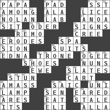 ACROSS 1. Dad 5. Writing tablet 8. Fast jet (abbr.) 11. Amid 13. Wing 14. Louse (plural) 15. Pitcher Ryan 16. Experiment locale 17. Small Philippine buffalo 18. Be seated 19. Baltic tributary 21. Omens 22. San ____ (Riviera town) 24. Algonquian 25. Eats (away) 27. Health resort 29. The Jewish people; Israel 30. Sets or collections 32. Pulitzer Prize-winning author Ferber 33. Marketplace scale 35. Double curve, resembling the letter S 39. Imelda's hoard 41. Religious women 42. She-sheep 43. Chalkboards 45. Astound 48. Heavy open wagon 49. Collect or gather 50. Ketch in the Levant 52. Single; one (prefix) 55. Desk light 56. Elected rep. 57. Having ears or earlike features 59. Ancient Greek god of war 60. Ingest 61. Having lost freshness 62. ___ a Wonderful Life 63. Connecticut Ivy Leaguer 64. Silent film actress Nazimova DOWN 1. Zero-star reviews 2. Mine, in Marseilles 3. Coward 4. Santa ___, CA 5. Light colored 6. Having or resembling wings 7. Pat or tap gently 8. Burn superficially 9. Biscuitlike quick bread 10. Afternoon social gatherings 12. Dwarf 14. Den 20. Two (Sp.) 21. Scram, to a cat 23. Ferber et al. 25. Compass dir. 26. To free from 27. Player for Phoenix 28. Sliced dessert 30. Mayday 31. Underwater navigation system 33. Pull behind 34. To riddle 36. From the throat 37. Compass dir. 38. Double-curved letter 40. Coop moms 43. _-fi 44. Shoestrings 45. Don Adams' spy role 46. Makes less strong or intense 47. United States Postal Service (abbr.) 49. Mountain range southwest of Kyrgyzstan 50. Lick closed 51. Against 53. 1994 drama film starring Jodie Foster 54. The content of cognition 56. Perceive with the eye 58. _ moment's notice (2 wds.)
