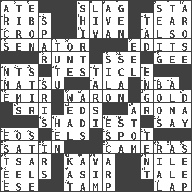 ACROSS 1. Had dinner 4. Volcanic refuse 8. R.R. building 11. Teases 13. Hub of activity 14. Rend 15. Riding implement 16. "Terrible" tsar 17. In addition 18. Legislator 21. Prepares for publication 22. Undersized animal 23. Compass dir. 25. Turn to the right 26. Mountains (abbr.) 29. A testis 32. Taiwanese island in East China Sea 34. According to 35. Basketball assoc. 38. Independent ruler or chieftain 39. Make _____ (do battle with) 41. Gilded 43. Indian title of respect (Mr.) 44. Begley and Asner 45. Odor 46. Most dark, concealed or hidden 50. Declare 51. Greek goddess of the dawn 54. Raised railways 55. Blemish 57. Smooth fabric 59. Devices for capturing images 63. Russian ruler of old 64. Polynesian shrub of the pepper family 67. Mediterranean tributary 68. Snakelike fish 69. SW Saudi Arabia district 70. Lie 71. Compass dir. 72. Pack (down) 73. Infant locale DOWN 1. Curves 2. Become fatigued 3. Inky black, to poets 4. Upper-body garments 5. 54 in ancient Rome 6. Actress Gardner 7. Commissioned military rank (abbr.) 8. Major League Baseball Commissioner Bud 9. Clothes sense 10. Came up 12. Practice fight 14. Small amount or degree 19. Ballerina skirt 20. Single 21. Snakelike fish 23. Grain storage tower 24. Glance over 26. Madame (abbr.) 27. Scottish caps 28. Use a spoon 30. Tarsus (plural) 31. Engineer (abbr.) 33. Indian titles of respect 36. Expressions of contempt or scorn 37. _ mater 39. Welt 40. Sums up 42. 24 hours 45. Smallest unit of an element 47. Layer 48. Fortification 49. Health resort 51. First name in cosmetics 52. Fertile tracts in a desert 53. Having lost freshness 56. Portable shelter 58. Big collection agency 60. Monetary unit of Yemen 61. Silent film actress Nazimova 62. Ooze 64. Krazy ___ of comics 65. White ___ sheet 66. Zeal