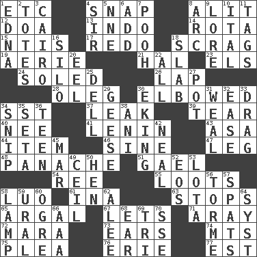 ACROSS 1. And so on (abbr.) 4. Fastener 8. Came down and settled, as after flight 12. ___ good deed 13. Southeast Asian peninsula 14. Round or rotation of duties 15. Nuclear Threat Initiatives 17. Do over again 18. Strangle with an iron collar 19. Nest on high 21. Actor Linden 23. Raised railways 24. Having a sole or soles 26. Infant locale 28. Cassini of fashion 30. Turned at an angle; bent 34. Fast jet (abbr.) 37. Path through which fluid escapes 39. Pull into pieces 40. Born 41. Soviet premier 1918-24 43. White ___ sheet 44. A whole individual unit 46. Trig term 47. Part of a journey 48. Flamboyance 51. Highlander 54. To sift 55. Plunders 58. Nilotic language 61. _ tizzy (2 wds.) 63. Obstructs or blocks passage 65. Therefore, facetiously 67. Allows 71. Like ___ of sunshine 72. Hindu Mythology: god of death 73. Hearing organs 74. Mountains (abbr.) 75. Entreaty 76. One of the Great Lakes 77. Eastern Standard Time (abbr.) DOWN 1. Pulitzer Prize-winning author Ferber 2. Hauls 3. Capital of Egypt 4. Title for a knight 5. Compass dir. 6. Say or write further 7. "Silly old bear" 8. Curve 9. Old wives' tales, e.g. 10. Slanted text style (abbr.) 11. Labels 16. Grain storage tower 18. Thick slice 20. Snakelike fish 22. 100% 25. Small valley 27. Cooking vessel 29. Honkers 30. Supplementing with great effort 31. Welt 32. Comfort 33. To trail on the ground 34. Sever or remove by pinching or nipping 35. Bristle 36. Adolescent 38. Cuckoo 42. Be tempered by heat 45. Make imperfect 49. To provide with a ceiling 50. Layer 52. Greek goddess of the dawn 53. Globular water bottle used in Asia 56. Singer Mel 57. Arguments over trivial matters 58. Desk light 59. Mountain range 60. Legendary monster 62. Toward shelter 64. System (abbr.) 66. Auto club (abbr.) 68. Hearing organ 69. Three (prefix) 70. Compass dir.