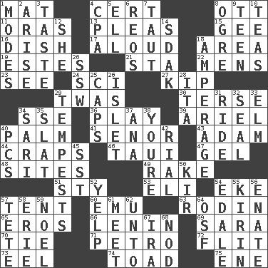 ACROSS 1. Floor covering 4. An absolute certainty 8. Baseball player Mel 11. Mouths or openings 13. Entreaties 15. Unit of force equal to gravity 16. Food container 17. Verbally 18. Type of rug 19. _____ Park, CO 21. R.R. building 22. Not women's 23. Perceive with the eye 24. _-fi 27. Sleep 29. It was, poetically 30. Laconic 34. Compass dir. 36. Shaw product 39. Satellite of Uranus 40. Inside of hand 41. Sir (Sp.) 43. First of billions? 44. Dice game 46. "Change" in Tahitian 47. Set 48. Locates 49. Libertine 51. Filthy place 53. Biblical high priest 54. Supplement with great effort 57. Portable shelter 60. Australian flightless bird 63. "The Thinker" sculptor 65. Greek god of love 66. Soviet premier 1918-24 69. "Two Mules for Sister ____" 70. Standoff 71. Stone: prefix 72. Secret move to avoid paying debts 73. Snakelike fish 74. Frog relative 75. Compass dir. DOWN 1. Methods 2. Ascend 3. Clothes sense 4. Accounting whiz (abbr.) 5. Pipe bend 6. Vintage cars 7. Tense 8. Legendary monster 9. Adolescent 10. Beverages made from leaves 12. A female animal or person 14. Neighbor of Neb. 18. Electrical Measurement 20. Compass dir. 25. Smile enhancers 26. Small island 28. Call ___ day 29. Storms 31. Travel on or in a vehicle 32. Lick closed 33. Shade tree 34. Indian skirt 35. Narrow board 37. Santa ___, CA 38. You are 40. Personal Computers (abbr.) 42. Monetary unit of Yemen 45. Fast jet (abbr.) 50. Apertif with cassis 52. Sharp bark 54. Peak District village in England 55. Japanese brewing company 56. Maternal 57. Wig 58. 4th largest of the Great Lakes 59. Christmas carol 61. Confront 62. To (old English) 64. Order of Saint Francis (abbr.) 67. Lyricist Gershwin 68. Lower and raise head in agreement
