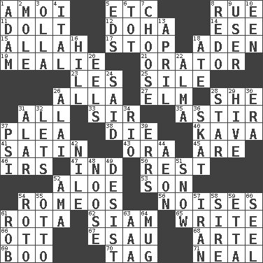ACROSS 1. Mine, in Marseilles 5. And so on (abbr.) 8. Sorrow 11. Dunce 12. Capital of the state of Qatar 14. Compass dir. 15. Assad's deity 17. Obstruct or block passage 18. Arabian gulf 19. Ear of corn 21. Speaker 23. French article 25. Filth; sediment 26. Silent film actress Nazimova 27. Shade tree 28. A female animal or person 31. Everything 33. Title for a knight 35. Being in motion 37. Entreaty 38. Pass on 40. Polynesian shrub of the pepper family 41. Smooth fabric 43. Mouth or opening 45. "We ___ not amused" (Victoria) 46. Big collection agency 47. Indiana (abbr.) 50. Take ten 52. _ vera 53. Male offspring 54. Lover boys 56. Annoying sounds 61. Roll call or roster of names 62. Thailand, formerly 65. Compose 66. Baseball player Mel 67. Son of Isaac 68. Johnson of "Laugh-In" 69. Surprise greeting 70. Label 71. Be tempered by heat DOWN 1. First of billions? 2. Undercover agent 3. Water jar 4. Slanted text style (abbr.) 5. Begley and Asner 6. Small child 7. Elect 8. Do over again 9. One who uses or employs something 10. Car or cant ending 13. Showery time 16. Land elevation 18. Had dinner 20. Snakelike fish 22. _ mater 24. Alleged 26. Jai ____ 28. Play the lead 29. Hub of activity 30. Epoch 31. Having or resembling wings 32. Allows 34. River (Sp.) 36. Three-handed card game 37. Air pressure measure (abbr.) 39. Blunders 42. Mediterranean tributary 44. A really long time 48. Trap for birds or small mammals 49. Stop 51. Frozen precipitation 52. Nanny (var.) 54. Printing process, for short 55. Von Bismarck 57. SW Asia republic 58. Title for a man of rank and authority 59. Singer James 60. Stitch closed the eyes of (a falcon) 61. Director Reiner 63. American Automobile Association (abbr.) 64. Java container