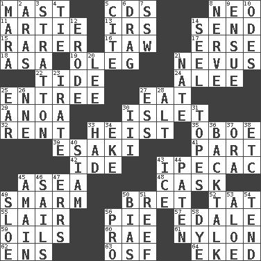 ACROSS 1. Vertical spar for supporting sails 5. Music discs 8. Modern: prefix 11. Nick name for Arthur 13. Big collection agency 14. Post 15. Less widely known 16. The 23rd letter of the Hebrew alphabet 17. Celtic language 18. White ___ sheet 19. Cassini of fashion 21. Congenital growth or mark on the skin 22. Periodic rise and fall of the sea level 24. Toward shelter 25. Main course 27. Erode 29. Small Philippine buffalo 30. Small island 32. Monthly bill 33. Robbery 35. Mitch Miller's instrument 39. 1973 Nobel Price Winner (Physics) Leo 41. Piece 42. Binary compound 43. Medicinal drug used to evoke vomiting 45. Toward the sea 48. Keg 49. Excessive but superficial compliments 50. Cy Young winner Saberhagen 52. Make lace 55. Den 56. Sliced dessert 57. Peak District village in England 59. Petroleums 60. Actress Charlotte 61. High-strength synthetic material 62. Followers of ems 63. Order of Saint Francis (abbr.) 64. Supplemented with great effort DOWN 1. Hindu Mythology: god of death 2. Ancient river in northeast Turkey 3. Ski resort town in Vermont 4. Standoff 5. Quote 6. To be drawn or hauled along 7. Compass dir. 8. Boldness 9. Take place subsequently 10. Lyric poems 12. Wear away 14. Sew up the eyelids of hawks and falcons 20. Area sheltered from the wind 21. Nathan's nickname 23. Feeling or showing extreme anger 25. Hearing organ 26. Compass dir. 27. Curvy letter 28. The first octave above the treble staff 30. One more than two 31. Drinks excessively 33. Possessed 34. Make supply last 36. Sass 37. Mouth or opening 38. And so on (abbr.) 40. Thailand, formerly 43. Frozen water 44. Eucharist need 45. At full speed 46. Travel by water 47. Blunders 49. _ gin 50. Prejudice 51. Coral ridge 53. Medicinal plant 54. Be inclined (to) 56. Adept person 58. Color