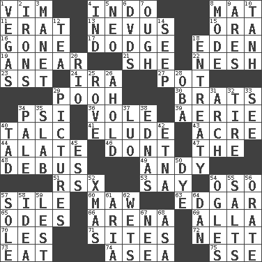 ACROSS 1. Zeal 4. _ china 8. Floor protector 11. Part of Q.E.F. 13. Mole, birthmark 15. Mouth or opening 16. Went 17. Evade 18. Paradise 19. Approach 21. A female animal or person 22. Soft 23. Fast jet (abbr.) 24. Retirement account (abbr.) 27. Plant holder 29. "Silly old bear" 30. Naughty children 34. 23rd letter of the Greek alphabet 36. Short-tailed, large-bodied rat 39. Nest on high 40. Baby powder 41. Evade 43. 1/640 square mile 44. Having winglike extensions 46. Do not 47. Definite Article 48. Alight from a bus 49. "60 Minutes" Commentator Rooney 51. Acura sports coupe 53. Declare 54. Bear (Spanish) 57. Drop; flow; fall 60. Informal term for the mouth 63. _ Allan Poe 65. Lyric poems 66. Sports stadium 69. Silent film actress Nazimova 70. French article 71. Settings 72. Remaining after all deductions 73. Ingest 74. At sea 75. Compass dir. DOWN 1. Viva Las _ 2. Metal shackles 3. French painter Edouard 4. Indiana (abbr.) 5. Modern: prefix 6. Movie discs 7. Ending for "Through" and "Enough" 8. Method 9. Ancient Greek god of war 10. Hyperbolic tangent 12. Beverage made from leaves 14. Ooze 18. Plea 20. River (Sp.) 25. Be footloose 26. Hold, grip (Informal) 28. Chief or king in Benin or Nigeria 29. Photos 31. Bowlike part 32. Become fatigued 33. Perceive with the eye 34. Diluted with white 35. Thick slice 37. Nilotic language 38. Ferber et al. 40. Bit 42. Inactive volcano in Sicily 45. Curvy letter 50. Color 52. Dec. holiday 54. Stares at amorously 55. Table seasonings 56. Declaim 57. Flatfish 58. The main thing one is thinking about 59. For fear that 61. Operatic vocal solo 62. Soaks 64. One of the 12 tribes of Israel 67. Born 68. White ___ sheet