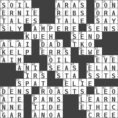 ACROSS 1. Earth 5. Caspian sea tributary 9. Spanish title 12. Bert's buddy 14. Confederate soldiers (slang) 15. Mouth or opening 16. Lies 17. Falsehood 18. Declare 19. Cunning 20. Electrical Unit 23. Elected reps. 24. Malaysian steamed pastry 25. Transmit 27. Jai _ 30. June honoree 32. Ring climax 33. Seaweed 34. Blunders 36. She-sheep 38. Direct toward a target or goal 39. Petroleum 40. First lady 43. Black tropical American cuckoo 46. Oceans 48. Flair 49. Big collection agency 51. R.R. building 52. Fast planes 53. Petty quarrel 54. Writer Wiesel 56. Cub Scout units 58. Exposes to great heat 61. Lion 64. Had dinner 65. Baking dishes 66. Acquire or gain knowledge or skills 68. Compass dir. 69. Periodic rise and fall of the sea level 70. Value system 71. Slender fish 72. Small Philippine buffalo 73. Algonquian DOWN 1. Puts into a specified state 2. Spoken 3. Inwardly 4. Untruth 5. Johnson of "Laugh-In" 6. Tail end 7. Most capable 8. Compass dir. 9. Administered medicine 10. Northwest Algerian city 11. Negative votes 13. Son of Isaac 21. Ancient Persian 22. N Egypt peninsula 23. Overwhelm 24. Sleep 26. Supplement with great effort 27. Alias (abbr.) 28. Luau accessory 29. _ mater 31. Frees from moisture 35. Chalkboards 37. Snakelike fish 41. Large container 42. Followers of ems 44. Pinches, bites 45. Retirement account (abbr.) 47. Table seasoning 48. Compass dir. 50. Put through a sieve 53. Contemptuous expression 55. Capri or Wright 56. Mild oath, euphamism for damn 57. Inactive volcano in Sicily 59. Southwest Nigerian state 60. At sea 61. Cowardly lion portrayer 62. 4th largest of the Great Lakes 63. At one time in the past 65. Parent Teacher Assoc. 67. And so on (abbr.)