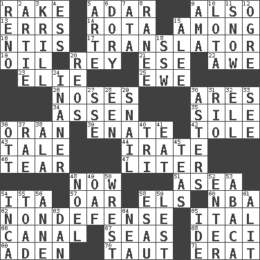 ACROSS 1. Immoral or dissolute person 5. The sixth month of the Jewish calendar 9. In addition 13. Blunders 14. Roll call or roster of names 15. Amid 16. Nuclear Threat Initiatives 17. Interpreter 19. Petroleum 20. Marina Del _, California 21. Compass dir. 22. Deep reverence 23. Writer Wiesel 25. She-sheep 26. Olfactory organs 30. Ancient Greek god of war 34. NE Netherlands city 35. Drop; flow; fall 36. NW Algerian seaport 39. Related on the mother's side 42. Lacquered or enameled metalware 43. Falsehood 44. Feeling or showing extreme anger 46. Pull apart 47. 61 cubic inches 48. At this time 51. Toward the sea 54. Call ___ day 57. Rowing implement 58. Raised railways 60. Basketball assoc. 62. Unrelated to defense, as in spending 65. Slanted text style (abbr.) 66. Lessep's creation 67. Oceans 68. Tenth: prefix 69. Arabian gulf 70. Strained 71. Part of Q.E.F. DOWN 1. Western Nevada city 2. Nick name for Arthur 3. The principal food of baleen whales 4. Curvy letter 5. Johnson of "Laugh-In" 6. Rowboat 7. "One Day ___ Time" 8. The wife of a rajah (variant) 9. Nursemaid (var.) 10. Globular water bottle used in Asia 11. Overwhelm 12. Legendary monster 15. Toward shelter 18. Compass dir. 20. Vintage cars 24. More lacking in sense or substance 27. Compass dir. 28. Car or cant ending 29. Slow-paced one 30. Michaelmas daisies 31. _ de Janeiro 32. Pipe bend 33. Perceive with the eye 36. Baseball player Mel 37. Actress Charlotte 38. In the manner of 40. Three (prefix) 41. Ingest 45. Beverages made from leaves 48. Christmas carol 49. Clumsy lout 50. Obtain by seizing forcibly or violently 52. Keyboard key 53. Phillipine bananalike plant 54. South American Indian 55. Frog relative 56. Singer Murray 58. He sold his birthright 59. For fear that 61. Came down and settled, as after flight 63. One of the 12 tribes of Israel 64. Teachers' org. 65. Binary compound