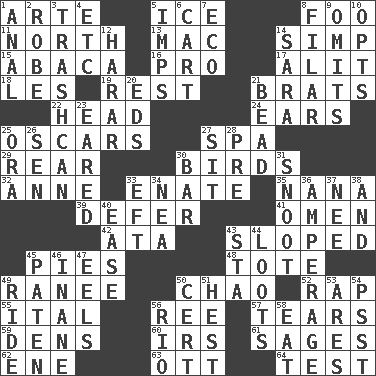 ACROSS 1. Johnson of "Laugh-In" 5. Frozen water 8. Egg _ yung 11. 0 degrees 13. Big _ 14. Simple or foolish person 15. Phillipine bananalike plant 16. Adept person 17. Set down 18. French article 19. Take ten 21. Naughty children 22. Froth on beer 24. Hearing organs 25. Motion picture awards 27. Health resort 29. Tail end 30. Avian creatures 32. Singer Murray 33. Maternal 35. Grandmother 39. Postpone 41. Sign of something about to happen 42. "One Day ___ Time" 43. Slanted 45. Sliced desserts 48. Carryall 49. The wife of a rajah (variant) 50. US Secretary of Labor Elaine L. _ 52. Strike 55. Slanted text style (abbr.) 56. Portuguese money of account (variant) 57. Pulls apart 59. Lairs 60. Big collection agency 61. Gurus 62. Compass dir. 63. Baseball player Mel 64. Trial DOWN 1. Of or related to the anus 2. Loose flowing garment 3. File 13 4. And so on (abbr.) 5. Naughty children 6. Haul 7. Environmental prefix 8. Of or pertaining to a thread or threads 9. Leaves out 10. Chooses 12. Ethiopian city, capital of Harari 14. "Two Mules for Sister ____" 20. Begley and Asner 21. Necklace unit 23. Having ears or earlike features 25. Mouth or opening 26. Elected rep. 27. Be seated 28. Before (prefix) 30. Tavern 31. Snout, nose 33. Bank Draft (abbr.) 34. Teachers' org. 36. Electrical Measurement 37. Born 38. Added to 40. Relaxation 43. R.R. building 44. Plunders 45. Eucharist need 46. Empty; void 47. Snakelike fish 49. Travel on or in a vehicle 50. Certainty 51. Command 53. Ancient Greek god of war 54. Inconspicuous attention getter 56. River (Sp.) 58. Erode