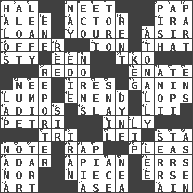 ACROSS 1. Actor Linden 4. Rendezvous 8. Infant food 11. Toward shelter 13. Thespian 15. Retirement account (abbr.) 16. Grant temporary use of 17. You are 18. SW Saudi Arabia district 19. Auction bid 21. Electrically charged atom 22. Not this but _ 23. Filthy place 24. Car or cant ending 27. Ring climax 29. Do over again 30. Maternal 34. Born 36. Angers 39. Street urchin 40. Mass 41. Make improvements or corrections to 43. Chops off 44. Goodbye (Sp.) 46. Kill 47. Cards in a Roman deck? 48. _ dish (used to culture cells) 49. In an inward manner 51. Three (prefix) 53. Flowery wreath 54. R.R. building 57. Observe 60. Hit sharply and swiftly 63. Entreaties 65. The sixth month of the Jewish calendar 66. Bee-related 69. Blunders 70. Or not 71. Sibling's daughter 72. Celtic language 73. Tate display 74. At sea 75. The 18th letter of the Arabic alphabet DOWN 1. Rings 2. At or to great height 3. Like summer trees 4. Can I? 5. Environmental prefix 6. Needle case 7. "Corrida" creature 8. Expression of disdain 9. Roberta Peters solo 10. Role in a play 12. Compass dir. 14. Monthly bill 18. Lacking a tonal center or key 20. To sift 25. Singer Brickell 26. Typical models 28. Cask 29. Newsperson 31. Mine, in Marseilles 32. Native american tent (variation) 33. Followers of ems 34. Naked 35. Send forth 37. Snakelike fish 38. Slow-paced one 40. Pet locale 42. Unit of force 45. Title for a knight 50. Mouth edge 52. SW Asia republic 54. Spanish missionary in California 55. Tarsus (plural) 56. NE Netherlands city 57. Nanny 58. Scent 59. Small pie 61. Capital of Western Samoa 62. Sliced desserts 64. Area sheltered from the wind 67. Adept person 68. Teachers' org.