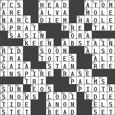 ACROSS 1. Personal Computers (abbr.) 4. Froth on beer 8. Tiny particle 12. "We ___ not amused" (Victoria) 13. Inventor's middle name 14. Undercover agent 15. Drug cop 17. South Vietnam president (1954) 18. White Person, in Hawaii 19. Small fatty European fish 21. Before (prefix) 23. Make lace 24. Indian antelope 26. Mouth or opening 28. Peachy ____! 30. Refrain by choice 34. To free from 37. Within a short period 39. In addition 40. Lyricist Gershwin 41. Lugs 43. Keyboard modifier key 44. Greek goddess of the earth (variant) 46. Comedian Laurel of Laurel & Hardy 47. To riddle 48. Stimulate to action 51. To erase 54. Three (prefix) 55. Insides of hands 58. Player for Phoenix 61. Greek goddess of the dawn 63. Peter (Polish) 65. Overwhelms 67. Farming town in central California 71. Singer Brickell 72. Event that recurs at intervals 73. Soon (poet.) 74. Raised railways 75. Proofreading order 76. Necklace unit 77. Put into a specified state DOWN 1. Baking dishes 2. Dice game 3. Father Junipero _ 4. Possessed 5. Connecticut Ivy Leaguer 6. "___ Maria" 7. Moist 8. Housemaid (var.) 9. A blast of a horn 10. Spanish pot 11. Rendezvous 16. Keg 18. Possessive pronoun 20. Standoff 22. Director Reiner 25. A home for chicks 27. "One Day ___ Time" 29. Trap for birds or small mammals 30. Approach 31. Having or resembling wings 32. Small island 33. Musical sound 34. Swiss mountan, "Queen of the Mountains" 35. SW Asia republic 36. Raised platform 38. Baseball player Mel 42. Fastener 45. Fitting 49. Angers 50. _ de Janeiro 52. Plant excrement 53. Writer Wiesel 56. Methods 57. Vertical member of a panel or frame 58. Fast planes 59. A single undivided whole 60. Connecting point 62. Thick slice 64. State of inaction 66. Soggy 68. Single 69. ___ good deed 70. Indiana (abbr.)