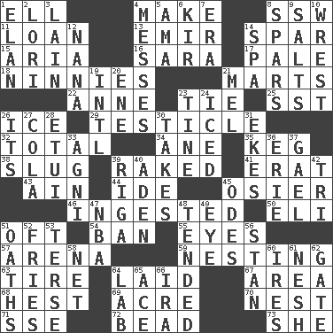ACROSS 1. Pipe bend 4. Create 8. Compass dir. 11. Grant temporary use of 13. Arab leader 14. Practice fight 15. Roberta Peters solo 16. "Two Mules for Sister ____" 17. Light colored 18. Simpletons 21. Shops 22. Queen of England 1702-14 23. Standoff 25. Fast jet (abbr.) 26. Frozen water 29. A testis 32. "_____ Recall" 34. One (Scot) 35. Cask 38. Snaillike creature with no shell 39. Moved through 41. Part of Q.E.F. 43. The 18th letter of the Arabic alphabet 44. Binary compound 45. Flexible twig of a willow tree 46. Eaten 50. Connecticut Ivy Leaguer 51. Often (poetically) 54. Bar 55. Snake ____ (dice throw) 57. Sports stadium 59. Inhabiting a nest 63. Hoop that covers a wheel 64. Put down 67. Length times width 68. Command 69. 43,560 square feet 70. Egg locale 71. Compass dir. 72. Necklace unit 73. A female animal or person DOWN 1. Enthusiasm 2. Australian parrot (variant) 3. (Had) reclined 4. Makes clutter 5. Nursemaid (var.) 6. Apertif with cassis 7. Period 8. Practice fights 9. Table seasonings 10. Take or capture by force 12. Grandmother 14. Health resort 19. International (abbr.) 20. Compass dir. 21. Cartoonist voice _ Blanc 23. Prong on a fork 24. On the rocks 26. It is 27. Root beer relative 28. Needle case 30. Receives possession of 31. Supplements with great effort 33. Hindu god of fire 36. 4th largest of the Great Lakes 37. Highlander 39. Port city in Latvia 40. An important port of Yemen 42. Three (prefix) 45. Lyric poems 47. Basketball assoc. 48. Watched over 49. Sight organ 51. Profane or obscene expressions 52. Strips of potato fried in deep fat 53. Laconic 56. Comedian Laurel of Laurel & Hardy 58. Fish or hair follower 60. Angers 61. Tender 62. Yard entry 64. Experiment locale 65. Adept person 66. Lyricist Gershwin