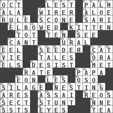 ACROSS 1. Sep. follower 4. For fear that 8. Inside of hand 12. Chicken ___ king 13. One who wires 14. Medicinal plant 15. Court order 17. Biscuitlike quick bread 18. Indian skirt 19. Shoved, as through a crowd 21. Baby cat 23. Small child 24. "___ Little Indians" 26. Observe 27. Patter 28. Mountain range 30. Snakelike fish 31. Sowing specialist 34. Feline 37. Compete 38. Lies 39. Mouth or opening 40. Raised railways 41. Cease 42. Was introduced to 43. Assign a rank or rating to 44. Dad 46. A really long time 47. French article 50. Bear (Spanish) 51. Fodder prepared in a silo 54. Inhabiting a nest 57. Ancient Greek god of war 58. Slender Brazilian palm 60. Vintage cars 62. Religious group 63. Difficult or unusual or dangerous feat 64. Compass dir. 65. Fast planes 66. Snake ____ (dice throw) 67. Afternoon social gathering DOWN 1. Boat paddle 2. A slight indication 3. Baron Munchausen's specialties 4. It is permitted: Lat. 5. Eat (away) 6. Elected rep. 7. Long journey 8. Soft color 9. Having winglike extensions 10. Old wives' tales, e.g. 11. Count _ (2 wds.) 13. Compass dir. 16. Inky black, to poets 20. Baseball player Mel 22. Austrian river, tributary to the Danube 25. Unadorned figures 27. To provide with a ceiling 29. Repose 30. First lady 31. Proofreading order 32. Artist's stand 33. Connecticut Ivy Leaguer 34. Part 35. Type of rug 36. Make lace 41. Mild oath, euphamism for damn 43. Ridicules or criticizes harshly 44. Cooking vessel 45. SW Saudi Arabia district 46. Choose 48. Take place subsequently 49. Seines 51. Backtalk 52. Angers 53. Comfort 55. Be seated 56. Went 59. Filthy place 61. Ocean
