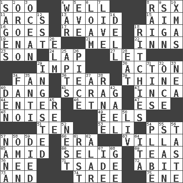ACROSS 1. "Barney Miller" actor Jack 4. Not ill 8. Acura sports coupe 11. Arches 13. Keep away from 15. Direct toward a target or goal 16. Travels 17. Break or tear apart 18. Port city in Latvia 19. Related on the mother's side 21. Cartoonist voice _ Blanc 22. Restaurants 23. Male offspring 24. Infant locale 27. Allow 29. Body of Kaffir warriors 30. Gambison 34. Avid follower 36. Pull into pieces 39. One or ones belonging to thee 40. Mild oath, euphamism for damn 41. Strangle with an iron collar 43. South American Indian 44. Keyboard key 46. Inactive volcano in Sicily 47. Compass dir. 48. Annoying sound 49. Snakelike fish 51. "___ Little Indians" 53. Biblical high priest 54. Pacific Standard Time (abbr.) 57. Thickened enlargement 60. Epoch 63. Country estate 65. Among 66. Former Milwaukee Brewers owner Bud 69. Afternoon social gatherings 70. Born 71. Sadhe (variant) 72. "This won't hurt ____!" 73. Plus 74. Woody plant 75. Compass dir. DOWN 1. Gurus 2. U. of Maine site 3. Sea 4. Armed conflict 5. First lady 6. Rich soil 7. Moving, as bait 8. Precipitation 9. Omen 10. Dec. holiday 12. Fast jet (abbr.) 14. Small valley 18. Actors Guy, Robert Welles, and Clint 20. Shade tree 25. Flats, for short 26. Part 28. Ingest 29. Consumed 31. Metal containers 32. Single time 33. Teachers' org. 34. Papal veil 35. Against 37. Nonscientific branch of learning 38. The wife of a rajah (variant) 40. Lair 42. Highlander 45. To separate or throw off 50. 54 in ancient Rome 52. Egg locale 54. First-year military academy student 55. Killed 56. Clothes sense 57. Nanny 58. Sign of things to come 59. Passed on 61. Repose 62. Having or resembling wings 64. Call ___ day 67. Binary compound 68. Unit of force equal to gravity