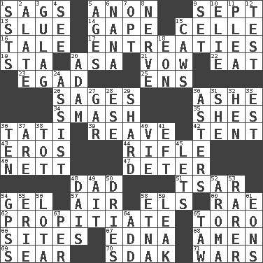 ACROSS 1. Sinks 5. Soon (poet.) 9. Back-to-school mo. 13. Change direction abruptly 14. Open wide 15. Cell (Danish) 16. Lie 17. Pleas 19. R.R. building 20. White ___ sheet 21. Solemn pledge 22. Erode 23. Mild oath 25. Followers of ems 26. Gurus 30. American tennis player Robert 34. Box-office sellout 35. "______ My Girl" (Turtles hit) 36. Jacques of French films 39. Rob, plunder, or pillage 42. Portable shelter 43. Greek god of love 44. Ransack; plunder; pillage 46. Remaining after all deductions 47. Prevent from occurring 48. June honoree 51. Russian ruler of old 54. Set 57. Atmosphere 58. Raised railways 60. Actress Charlotte 62. Appease 65. "Corrida" creature 66. Settings 67. Pulitzer Prize-winning author Ferber 68. So be it 69. Shrivel 70. Neighbor of Neb. 71. Armed conflicts DOWN 1. Fast planes 2. Having winglike extensions 3. POW camp 4. Observe 5. Grows older 6. Nanny 7. Elect 8. Impudent aggressiveness 9. Arrange properly for use 10. Writer Wiesel 11. Entreaty 12. Trial 15. Crow sounds 18. Period of immesurable duration 20. First man 24. Aid 27. Slender fish 28. Compass dir. 29. Pottery fragment 30. Michaelmas daisies 31. A female animal or person 32. Layer 33. Eastern Standard Time (abbr.) 36. "___ Little Indians" 37. "We ___ not amused" (Victoria) 38. Small child 40. Compete 41. Newt 45. Allows 48. Raised platform 49. Small island 50. Frees from moisture 52. Odor 53. More uncommon 54. Global Positioning Systems (abbr.) 55. One of the Great Lakes 56. Globular water bottle used in Asia 58. Inactive volcano in Sicily 59. Path through which fluid escapes 61. Immeasurably long periods of time 63. For each 64. Increase 65. The 23rd letter of the Hebrew alphabet