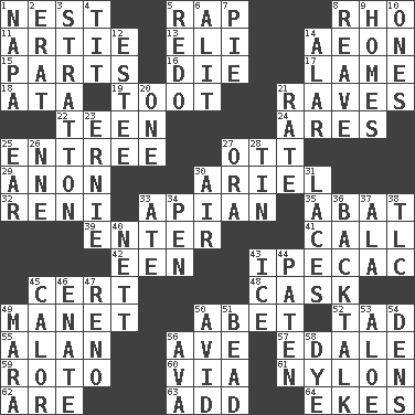 ACROSS 1. A home for chicks 5. Reproach for some lapse or misdeed 8. 17th letter of the Greek alphabet 11. Nick name for Arthur 13. Biblical high priest 14. A really long time 15. Components 16. Pass on 17. Unable to walk 18. _ moment's notice (2 wds.) 19. A blast of a horn 21. All-night dance parties 22. Adolescent 24. Ancient Greek god of war 25. Main course 27. Baseball player Mel 29. Soon (poet.) 30. Satellite of Uranus 32. Painter Guido (1575-1642) 33. Bee-related 35. Blind as ____ 39. Keyboard key 41. Give a ring to 42. Car or cant ending 43. Medicinal drug used to evoke vomiting 45. Sure thing 48. Keg 49. French painter Edouard 50. Collude with 52. Bit 55. Actor Alda or Thicke 56. "___ Maria" 57. Peak District village in England 59. Printing process, for short 60. By way of 61. High-strength synthetic material 62. "We ___ not amused" (Victoria) 63. Say or write further 64. Makes supply last DOWN 1. California wine valley 2. Part of Q.E.F. 3. Ski resort town in Vermont 4. Teat (slang) 5. Redecorate 6. Set down 7. Sliced dessert 8. Rob, plunder, or pillage 9. Dwellings 10. Singles 12. First name in cosmetics 14. Having or resembling wings 20. Single 21. Assign a rank or rating to 23. Bert's buddy 25. Hearing organ 26. Compass dir. 27. Mouth or opening 28. Shallow baking pan 30. Atmosphere 31. Shoestrings 33. Had dinner 34. Fenced enclosure 36. Sass 37. According to 38. Affectionate concern, for short 40. Remaining after all deductions 43. Frozen water 44. Eucharist need 45. Bodily heat indicating an inflammation 46. Maternal 47. Western Nevada city 49. Hindu Mythology: god of death 50. Enthusiastic 51. Necklace unit 53. _ vera 54. Lairs 56. Actress Gardner 58. Color