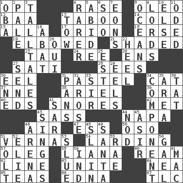 ACROSS 1. Elect 4. Raze (variant) 8. Margarine 12. Sound made by sheep 13. Off limits 14. Lacking warmth 15. Silent film actress Nazimova 17. Greek mythologigal hunter 18. Celtic language 19. Shoved, as through a crowd 21. Cast a shadow over 23. The 19th letter of the Greek alphabet 24. To separate or throw off 26. Followers of ems 27. Suttee (variant) 28. Perceives with the eye 30. Snakelike fish 31. Soft color 34. Domesticated feline 37. Compass dir. 38. Satellite of Uranus 39. Mouth or opening 40. Begley and Asner 41. Sounds asleep 42. Was introduced to 43. Backtalk 44. California wine valley 46. Atmosphere 47. Double-curved letter 50. Bear (Spanish) 51. Actresses Bloom and Felton 54. Preparing or cooking with lard 57. Cassini of fashion 58. Climbing, woody, usually tropical vines 60. 480, 500 or 516 sheets of paper 62. Actor's bit 63. Join together 64. Teachers' org. 65. Beverages made from leaves 66. Pulitzer Prize-winning author Ferber 67. Affectionate concern, for short DOWN 1. Chief or king in Benin or Nigeria 2. Light colored 3. Baron Munchausen's specialties 4. More uncommon 5. Stay 6. "Barney Miller" actor Jack 7. Immeasurably long periods of time 8. Seas 9. Domineers 10. Otherwise 11. Wrote a lyric poem 13. Pull behind 16. Blind as ____ 20. Fr. "Yes" 22. Person who is morally reprehensible 25. First name in cosmetics 27. Transmit 29. Snakelike fish 30. Compass dir. 31. Baking dishes 32. Came up 33. Title for a knight 34. Part 35. Length times width 36. Make lace 41. "Two Mules for Sister ____" 43. Scorches 44. Lower and raise head in agreement 45. SW Saudi Arabia district 46. Sports stadium 48. Killed 49. Before Barbara or Clara 51. Electrical Unit 52. Writer Wiesel 53. Change direction abruptly 55. Actress Charlotte 56. Highlander 59. Indiana (abbr.) 61. Apple computer (short form)