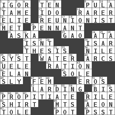 ACROSS 1. Russian composer Stravinsky 5. "___ Little Indians" 8. Monetary unit of Botswana 12. Docile 13. Wedding promise 14. Less widely known 15. Writer Wiesel 16. One who advocates reunion 19. Was introduced to 20. Pre-World Series prize 21. "____ silly question..." 23. E Mali city 24. _ moment's notice (2 wds.) 27. Is not 30. Austrian river, tributary to the Danube 31. College paper 34. Mediterranean tributary 35. System (abbr.) 38. Wetness 40. Arches 41. Ubangi River tributary 42. Food allowance for one day 44. Style 45. Not divided or shared with others 46. Cunning 47. Opposite of masc. 50. Greek god of love 53. Preparing or cooking with lard 57. Twice 59. Conciliate 63. Cause heat under the collar 64. Chest covering 65. Mountains (abbr.) 66. A really long time 67. Lacquered or enameled metalware 68. Cooking vessel 69. Inconspicuous attention getter DOWN 1. Detail 2. An organ shaped like a helmet 3. Leaves out 4. To separate or throw off 5. Become fatigued 6. Locale of original sin 7. Part of speech 8. Baking dish 9. RI univ. 10. French article 11. Nonscientific branch of learning 14. Printing process, for short 17. Tired old horse 18. _ tizzy (2 wds.) 20. Romantic infatuation 22. Baby cat 24. SW Saudi Arabia district 25. Baby powder 26. Ancient Greek god of war 28. ___ Haven, CT 29. Russian ruler of old 30. More lacking in sense or substance 32. Call ___ day 33. Puts into a specified state 35. Takes to court 36. Shout 37. Kill 39. River (Sp.) 43. Cassini of fashion 47. Secret move to avoid paying debts 48. Erode 49. Medical imaging device (abbr.) 51. Off-Broadway awards 52. Grain storage towers 54. Moist 55. "Tell ____ the Marines!" 56. Egg locale 58. Transmitted 59. Pacific Standard Time (abbr.) 60. 17th letter of the Greek alphabet 61. Lubricate 62. Before (prefix) 63. Strike