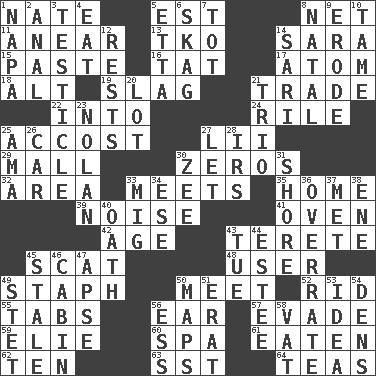 ACROSS 1. Nathan's nickname 5. Eastern Standard Time (abbr.) 8. Fish or hair follower 11. Approach 13. Ring climax 14. "Two Mules for Sister ____" 15. Thick mixture 16. Make lace 17. Tiny particle 18. The first octave above the treble staff 19. Volcanic refuse 21. Barter 22. To the inside or interior of 24. Cause heat under the collar 25. Buttonhole 27. Cards in a Roman deck? 29. Promenade 30. Nothings 32. Length times width 33. Confronts 35. Dwelling 39. Annoying sound 41. Baking chamber 42. Grow older 43. Cigar-shaped 45. Go away! 48. One who makes use of a thing 49. Staphylococcus 50. Rendezvous 52. To free from 55. Bar bills 56. Ewer handle 57. Elude 59. Writer Wiesel 60. Health resort 61. Ingested 62. "___ Little Indians" 63. Fast jet (abbr.) 64. Beverages made from leaves DOWN 1. California wine valley 2. Of or related to the anus 3. One of the two male reproductive glands 4. Erode 5. Singer James 6. Heroin 7. Small child 8. Brizilian seaport 9. Eat (away) 10. Docile 12. Musical pauses 14. Indian skirt 20. Car dealer's back yard 21. Musical group of three 23. Pitcher Ryan 25. Nursemaid (var.) 26. Automobile 27. Allow 28. Big collection agency 30. Last letter of the English alphabet 31. Dinah or Pauly 33. Russian fighter aircraft 34. Compass dir. 36. Make much ado about nothing 37. Was introduced to 38. Compass dir. 40. Pledge 43. Third day of the wk. 44. First name in cosmetics 45. Having lost freshness 46. Apartment or room in a ship 47. Domed church section 49. Proofreading order 50. Atlas contents 51. Part of Q.E.F. 53. It may be bright or harebrained 54. Cub Scout units 56. Double-curved letter 58. Large container