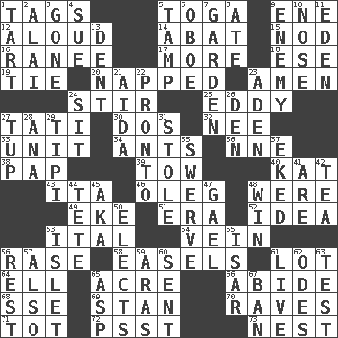 ACROSS 1. Labels 5. Ancient Roman robe 9. Compass dir. 12. Verbally 14. Blind as ____ 15. Lower and raise head in agreement 16. Indian princess (variant) 17. Greater amount 18. Compass dir. 19. Make a knot 20. Slept 23. So be it 24. Move through with a circular motion 25. Whirlpool 27. Jacques of French films 30. Two (Sp.) 32. Born 33. A single undivided whole 34. Pismires 36. Compass dir. 38. Infant food 39. Pull behind 40. Krazy ___ of comics 43. Call ___ day 46. Cassini of fashion 48. We are 49. Make supply last 51. Epoch 52. It may be bright or harebrained 53. Slanted text style (abbr.) 54. Distinctive style or manner 56. To erase 58. Artist's stands 61. Car dealer's back yard 64. Pipe bend 65. 43,560 square feet 66. Remain 68. Compass dir. 69. Comedian Laurel of Laurel & Hardy 70. All-night dance parties 71. Small child 72. Inconspicuous attention getter 73. A home for chicks DOWN 1. Small pie 2. Mountain range southwest of Kyrgyzstan 3. Went 4. Take to court 5. Pack (down) 6. Mitch Miller's instrument 7. Place where plants grow 8. Had dinner 9. Foe 10. Characteristic smell of wine 11. Genesis locale 13. Incision 21. Opera by Verdi 22. Right away 23. Arabian gulf 24. Be seated 26. Lair 27. Uncastrated adult male sheep 28. Santa ___, CA 29. Native american tent (variation) 31. Fur scarf 35. Turn aside suddenly 37. Supplemented with great effort 41. "We ___ not amused" (Victoria) 42. Beverage made from leaves 44. Wig 45. Alias (abbr.) 47. Highlander 48. Acquire through effort 50. Chooses 53. Small island 55. Austrian river, tributary to the Danube 56. State of inaction 57. In addition 59. Ancient river in northeast Turkey 60. Emitted 61. Moving, as bait 62. Lyric poems 63. Trial 65. Viper 67. Bar