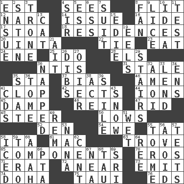 ACROSS 1. Eastern Standard Time (abbr.) 4. Observes 8. Secret move to avoid paying debts 12. Drug cop 14. Come out of 16. Helper 17. Portico 18. Homes 20. National forest in Provo, Utah 22. Neckwear 23. Ingest 24. Compass dir. 25. Wedding promise 28. Raised railways 30. Nuclear Threat Initiatives 31. Lacking originality or spontaneity 35. R.R. building 37. Prejudice 40. So be it 41. Hoof sound 42. Religious groups 44. Charged atoms 45. Moist 46. It's straight from the horse's mouth 47. To free from 48. Guide 50. Moos 52. Lair 54. She-sheep 55. Make lace 58. Call ___ day 61. Apple computer (short form) 63. Collection of objects 65. Pieces 70. Greek god of love 71. Part of Q.E.F. 72. Approach 73. Give off 74. Capital of the state of Qatar 75. "Change" in Tahitian 76. Begley and Asner DOWN 1. Follow as a consequence or result 2. Smooth fabric 3. Heavy duty weighing machine 4. Title for a knight 5. Compass dir. 6. Curvy letter 7. Set or collection 8. Air blower 9. Louse (plural) 10. The content of cognition 11. Trial 13. Domesticated feline 15. Singer Brickell 19. Snakelike fish 21. Small island 26. Claim 27. Flexible twig of a willow tree 29. Flight of steps 30. Slept 32. Mine, in Marseilles 33. Grant temporary use of 34. Followers of ems 35. Narrow board 36. Heavy book 38. Adept person 39. Vertical member of a panel or frame 41. Music discs 43. Frozen precipitation 49. San ____ (Riviera town) 51. Soggy 53. Nanny 55. Singer Mel 56. Prevent from happening 57. Trials 58. On the rocks 59. "Corrida" creature 60. Housemaid 62. Penny 64. To separate or throw off 66. Parent Teacher Association (abbr.) 67. Teachers' org. 68. The 19th letter of the Greek alphabet 69. _ Lanka
