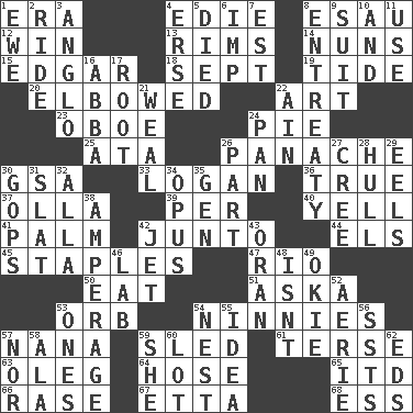 ACROSS 1. Period 4. Singer Brickell 8. He sold his birthright 12. Acquire through effort 13. Basketball hoops 14. Religious women 15. _ Allan Poe 18. Back-to-school mo. 19. Periodic rise and fall of the sea level 20. Shoved, as through a crowd 22. Tate display 23. Mitch Miller's instrument 24. Sliced dessert 25. "One Day ___ Time" 26. Flamboyance 30. Girls' org. (abbr.) 33. Utah city north of Ogden 36. Loyal 37. Spanish pot 39. For each 40. Shout 41. Inside of hand 42. Secret group 44. Raised railways 45. Paper fasteners 47. River (Sp.) 50. Ingest 51. "____ silly question..." 53. Globe 54. Fools 57. Grandmother 59. Downhill vehicle 61. Laconic 63. Cassini of fashion 64. Flexible conduit 65. It would 66. Raze (variant) 67. Singer James 68. Curvy letter DOWN 1. She-sheep 2. Travel on an animal 3. White American of non-Hispanic descent 4. Celtic language 5. Passed on 6. Naughty child 7. Eastern Standard Time (abbr.) 8. Plea 9. Set or collection 10. Plus 11. Purpose 16. Swedish rock group 17. Carrot, for example 21. Welt 22. The 18th letter of the Arabic alphabet 24. Baking dish 26. Role in a play 27. Algonquian 28. Frame or body of a ship 29. Snakelike fish 30. Republicans 31. Narrow board 32. Silent film actress Nazimova 34. Musical composition 35. Commissioned mil. rank 38. Electrical Measurement 42. Type of plane 43. Northwest Algerian city 46. Experiment locale 48. Is not 49. Migrant worker of the '30s 52. Nest on high 53. Singles 54. Egg locale 55. It may be bright or harebrained 56. Fast planes 57. And not 58. Chicken ___ king 59. A female animal or person 60. Car dealer's back yard 62. Begley and Asner