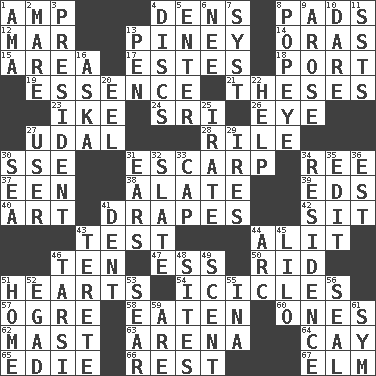 ACROSS 1. Electrical Unit 4. Cub Scout units 8. Groovy apts. 12. Third mo. 13. Abounding in pines 14. Mouths or openings 15. Length times width 17. _____ Park, CO 18. Sweet dark-red dessert wine 19. Core 21. College papers 23. Mamie's husband 24. _ Lanka 26. Sight organ 27. Allodial 28. Cause heat under the collar 30. Compass dir. 31. Fortification 34. To separate or throw off 37. Car or cant ending 38. Having winglike extensions 39. Begley and Asner 40. Tate display 41. Window treatments 42. Be seated 43. Trial 44. Set down 46. "___ Little Indians" 47. Curvy letter 50. To free from 51. Centers of feelings and intuitions 54. Winter's stalactites 57. Legendary monster 58. Consumed 60. Washington bills 62. Vertical spar for supporting sails 63. Sports stadium 64. Island 65. Singer Brickell 66. Respite 67. Shade tree DOWN 1. Nanny (var.) 2. Female horse 3. Elected leader of a country 4. Plates 5. Keyboard key 6. Born 7. System (abbr.) 8. Wimpy's pal 9. Came up 10. Have the gumption 11. Fast planes 13. Writing instrument 16. "____ silly question..." 20. Snakelike fish 22. Aid 25. Feeling or showing extreme anger 27. One who makes use of a thing 29. Angers 30. Ocean 31. Hearing organs 32. Schedule 33. Head covering 34. Home 35. Prepare for publication 36. Eastern Standard Time (abbr.) 41. Gouge 43. Cylindrical with tapered ends 44. Curve 45. _ and Stitch 46. Tarsus (plural) 48. Locates 49. Aroma 51. Dwelling 52. Mild oath 53. Dry up 55. _ tizzy (2 wds.) 56. Lick closed 59. "We ___ not amused" (Victoria) 61. Symbol (abbr.)
