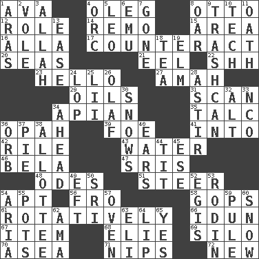 ACROSS 1. Actress Gardner 4. Cassini of fashion 8. Von Bismarck 12. Hero or heavy, e.g. 14. San ____ (Riviera town) 15. Length times width 16. Silent film actress Nazimova 17. Frustrate 20. Oceans 21. Snakelike fish 22. Quiet! 23. Phone greeting 27. Nursemaid 29. Lubricates 31. Examine hastily 34. Bee-related 35. Baby powder 36. Brightly colored fish 39. Enemy 41. To the inside or interior of 42. Cause heat under the collar 43. Wetness 46. Actor Lugosi 47. Indian titles of respect 48. Lyric poems 51. Navigate 54. Fitting 56. Back 58. Republicans 61. Happening in regular succession 66. Goddess of spring and wife of Bragi 67. Detail 68. Writer Wiesel 69. Grain storage tower 70. Toward the sea 71. Cuts off 72. ___ Haven, CT DOWN 1. Caspian sea tributary 2. Grand slam 3. Assad's deity 4. The grampus (Milton) 5. Lion 6. Australian flightless bird 7. Went 8. Boat paddle 9. File 13 10. Georgia ____ (Atlanta school) 11. Pledge 13. Comfort 18. Beverage made from leaves 19. Shade tree 24. Chop off 25. Cards in a Roman deck? 26. Norwegian king 28. Having gotten out of bed 30. Overwhelms 32. The first octave above the treble staff 33. Non-commissioned officer (abbr.) 34. Toward the future 36. Globe 37. Sliced dessert 38. One to whom something is allotted 40. Hearing organs 44. Teat (slang) 45. Compass dir. 49. Lizard (obsolete) 50. _ Lanka 52. The front part of a cuirass 53. "The Thinker" sculptor 54. Roberta Peters solo 55. Cooking vessels 57. Baking chamber 59. Whimper 60. Overwhelm 62. Wet nurse (var.) 63. Biblical high priest 64. Mouth edge 65. Consenting reply