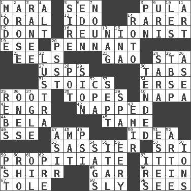 ACROSS 1. Hindu Mythology: god of death 5. Elected rep. 8. Monetary unit of Botswana 12. Spoken 13. Wedding promise 14. More uncommon 15. Do not 16. One who advocates reunion 19. Compass dir. 20. Pre-World Series prize 21. Snakelike fish 23. E Mali city 24. R.R. building 27. United States Postal Service (abbr.) 30. Bar bills 31. Unemotional ones 34. Celtic language 35. Carrot, for example 38. Drinks excessively 40. California wine valley 41. Engineer (abbr.) 42. Slept 44. Actor Lugosi 45. Not wild 46. Compass dir. 47. Electrical Unit 50. It may be bright or harebrained 53. More disrespectful 57. _ Lanka 59. Conciliate 63. "Tell ____ the Marines!" 64. Bake eggs in their shells 65. Slender fish 66. It's straight from the horse's mouth 67. Lacquered or enameled metalware 68. Wily 69. Perceives with the eye DOWN 1. Method 2. Came up 3. Indian princess (variant) 4. Keyboard modifier key 5. Father 6. Paradise 7. Part of speech 8. Baking dish 9. RI univ. 10. French article 11. Tate display 14. Printing process, for short 17. Tired old horse 18. _ tizzy (2 wds.) 20. Inconspicuous attention getter 22. A period of five years 24. "Two Mules for Sister ____" 25. Cook's measure (abbr.) 26. At sea 28. Cooking vessel 29. The Jewish people; Israel 30. Watched over 32. Numbers guy (abbr.) 33. Back-to-school mo. 35. Confederate soldiers (slang) 36. Singles 37. Stare at amorously 39. Health resort 43. Arab leader 47. SW Saudi Arabia district 48. Floor covering 49. Air pressure measure (abbr.) 51. First name in cosmetics 52. Nick name for Arthur 54. Sinks 55. Slanted text style (abbr.) 56. Suggestive of the supernatural 58. Charged particles 59. Pacific Standard Time (abbr.) 60. 17th letter of the Greek alphabet 61. Petroleum 62. Before (prefix) 63. Big collection agency