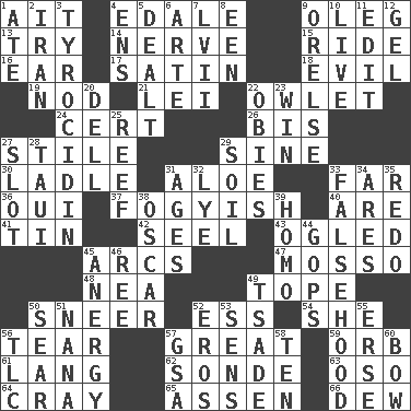 ACROSS 1. Small island 4. Peak District village in England 9. Cassini of fashion 13. Attempt 14. Boldness 15. Travel on an animal 16. Hearing organ 17. Smooth fabric 18. Tending to cause great harm 19. Allow head to fall sleepily 21. Luau accessory 22. A small or young owl 24. Sure thing 26. Twice 27. Vertical member of a panel or frame 29. Trig term 30. Dipping utensil 31. Medicinal plant 33. Distant 36. Fr. "Yes" 37. Out of fashion; old fashioned 40. "We ___ not amused" (Victoria) 41. Shallow baking pan 42. Stitch closed the eyes of (a falcon) 43. Stared 45. Curves 47. With motion or animation 48. Teachers' org. 49. Drink excessively 50. Scornful expression 52. Double-curved letter 54. A female animal or person 56. Rend 57. Relatively large 59. Globe 61. Austrian-born American filmmaker Fritz 62. Message 63. Bear (Spanish) 64. Supercomputer manufacturer 65. NE Netherlands city 66. Morning condensation DOWN 1. Had dinner 2. SW Asia republic 3. Polypeptide antibiotic 4. Followers of ems 5. Started a card game 6. Johnson of "Laugh-In" 7. 57 in ancient Rome 8. Car or cant ending 9. Threatening words 10. Moving, as bait 11. Prepare for publication 12. Set 20. Small valley 22. Off-Broadway awards 23. Victory 25. Coral ridge 27. Position in a hierarchy or organization 28. "Change" in Tahitian 29. Land 31. Eras 32. Sodium hydroxide 33. It jiggles the polygraph 34. Ancient Greek god of war 35. Redecorate 38. Motion picture award 39. Same (prefix) 44. Republicans 45. Disorder of the immune system 46. To sift 49. Sadhe (variant) 50. Shrivel 51. Grandmother 52. Greek god of love 53. Elected reps. 55. Celtic language 56. Affectionate concern, for short 57. Girls' org. (abbr.) 58. "___ Little Indians" 60. Arrow shooter