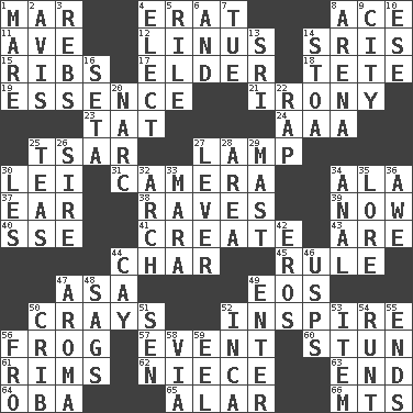 ACROSS 1. Make imperfect 4. Part of Q.E.F. 8. Adept person 11. "___ Maria" 12. "_ and Lucy" (Charlie Brown theme song) 14. Indian titles of respect 15. Chest bones 17. A person who is older than you are 18. Wig 19. Gist 21. Literary sarcasm 23. Make lace 24. American Automobile Association (abbr.) 25. Russian ruler of old 27. Desk light 30. Luau accessory 31. Device for capturing images 34. Wing 37. Ewer handle 38. All-night dance parties 39. At this time 40. Compass dir. 41. Make 43. "We ___ not amused" (Victoria) 44. Burn to charcoal 45. General guideline 47. White ___ sheet 49. Greek goddess of the dawn 50. Trading vessels 52. Stimulate to action 56. Tree-dwelling hopper 57. Happening 60. Astound 61. Basketball hoops 62. Sibling's daughter 63. Conclude 64. Chief or king in Benin or Nigeria 65. Having or resembling wings 66. Mountains (abbr.) DOWN 1. Female horse 2. Deliberation 3. Confederate soldiers (slang) 4. Voters do this 5. Cause heat under the collar 6. Plus 7. Third day of the wk. 8. Sports stadium 9. Municipality 10. Compass dir. 13. _ Lanka 14. Portico 16. Bristle 20. Drug cop 22. Strike 25. Afternoon social gatherings 26. Male parent of an animal 27. Prying instrument 28. Length times width 29. Vertical spar for supporting sails 30. French article 32. Bowlike part 33. Hindu Mythology: god of death 34. Of or related to the anus 35. Old wives' tales, e.g. 36. Deep reverence 42. Greek god of love 44. Island 46. United States Postal Service (abbr.) 47. Scent 48. Droops 49. Keyboard key 50. Baby bed with high sides 51. Elected rep. 52. South American Indian 53. Detail 54. Undersized animal 55. Extremities 56. From 58. By way of 59. Snakelike fish