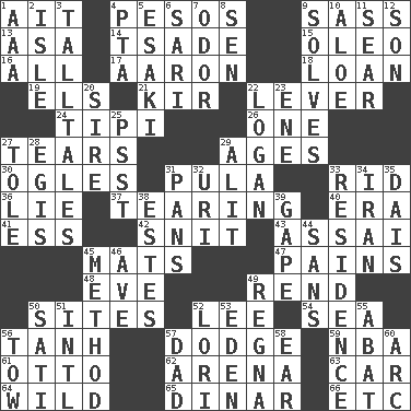 ACROSS 1. Small island 4. Mexican monetary units 9. Backtalk 13. White ___ sheet 14. Sadhe (variant) 15. Butter sub 16. 100% 17. Composer Copland 18. Grant temporary use of 19. Raised railways 21. Apertif with cassis 22. Prying instrument 24. Native american tent (variation) 26. Single 27. Separates forcefully 29. Eras 30. Stares 31. Monetary unit of Botswana 33. To free from 36. Untruth 37. Lacerating 40. Epoch 41. Double-curved letter 42. In a ____ (agitated or irritated) 43. Slender Brazilian palm 45. Floor coverings 47. Aches 48. First lady 49. Tear apart 50. Settings 52. Area sheltered from the wind 54. Ocean 56. Hyperbolic tangent 57. Evade 59. Basketball assoc. 61. Von Bismarck 62. Sports stadium 63. 4-wheeled motor vehicle 64. Rampant 65. Middle Eastern gold or silver currency 66. And so on (abbr.) DOWN 1. American Automobile Association (abbr.) 2. Small island 3. Baron Munchausen's specialties 4. Parent Teacher Assoc. 5. 1973 Nobel Price Winner (Physics) Leo 6. Indian skirt 7. Scent 8. Elected rep. 9. Finds the solution 10. _ vera 11. Shrivel 12. Manchild 20. The founder of a family 22. Utah city north of Ogden 23. Compass dir. 25. Inconspicuous attention getter 27. Lacquered or enameled metalware 28. The front part of a cuirass 29. Set down 31. Zero-star reviews 32. RI univ. 33. Dwelling 34. SW Asia republic 35. Raised platform 38. _____ Park, CO 39. Stare wonderingly 44. Without 45. Mode 46. "___ Maria" 49. Canadian anthropologist Darnell 50. Suttee (variant) 51. International (abbr.) 52. Australian parrot (variant) 53. Locale of original sin 55. Blind as ____ 56. Pull behind 57. June honoree 58. Hearing organ 60. Curve
