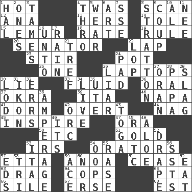 ACROSS 1. Being at a high temperature 4. It was, poetically 8. Examine hastily 12. Santa ___, CA 13. Possessive pronoun 14. Lacquered or enameled metalware 15. Arboreal primate 18. Assign a rank or rating to 19. Governing power 20. Elected representative 22. Pet locale 23. Use a swizzle stick 24. Plant holder 25. Single 26. Portable computers 30. Falsehood 33. Watery 36. Taken by mouth 37. Gumbo ingredient 39. Call ___ day 40. California wine valley 41. Dormintory (informal) 42. Unconcealed 44. Tired old horse 45. Stimulate to action 47. Mouth or opening 50. And so on (abbr.) 51. Aureate 53. Big collection agency 54. Speakers 57. Singer James 59. Small Philippine buffalo 61. Stop 63. To be drawn or hauled along 64. 911 reaches them 65. Parent Teacher Assoc. 66. Filth; sediment 67. Celtic language 68. Eastern Standard Time (abbr.) DOWN 1. Actor Linden 2. Singles 3. Makes less strong or intense 4. Through, poetically 5. Put on (as clothing) 6. Tate display 7. Compass dir. 8. Ski resort town in Vermont 9. Clever action or accomplishment 10. Everything 11. Born 16. To (old English) 17. Precipitation 21. Unclean, religiously 22. Trim (branches) 24. Groovy apt. 26. One who doesn't tell the truth 27. NW Algerian seaport 28. Dad 29. Volcanic refuse 30. Farming town in central California 31. Picture 32. Blunders 34. Moving, as bait 35. Shoshoni 38. Electrical Measurement 42. The grampus (Milton) 43. Ancient Roman robe 46. ___ a Wonderful Life 48. College mil. group 49. _ vera 52. Window treatment 53. Slanted text style (abbr.) 54. I made a mistake 55. To erase 56. Fast planes 57. Begley and Asner 58. Three (prefix) 59. Adept person 60. And not 62. Erode