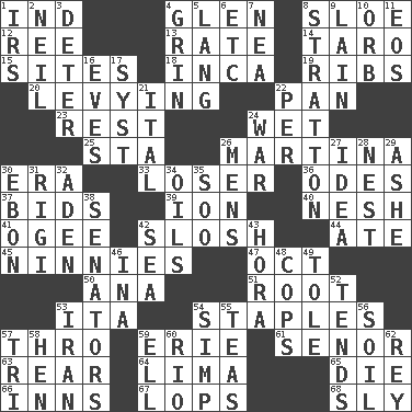 ACROSS 1. Indiana (abbr.) 4. Small, secluded valley 8. _ gin 12. To riddle 13. Pace 14. Pacific island yam 15. Locates 18. South American Indian 19. Chest bones 20. Imposing or collecting, as a tax 22. Baking dish 23. Respite 24. Dripping 25. R.R. building 26. Chrissie's court nemesis 30. Period 33. Failure 36. Lyric poems 37. Auction offers 39. Electrically charged atom 40. Tender 41. Double curve, resembling the letter S 42. Make a splashing sound 44. Had dinner 45. Simpletons 47. Sep. follower 50. Santa ___, CA 51. Carrot, for example 53. Call ___ day 54. Paper fasteners 57. Through, poetically 59. One of the Great Lakes 61. Sir (Sp.) 63. Tail end 64. Pale green bean 65. Pass on 66. Lodging establishments 67. Chops off 68. Cunning DOWN 1. Big collection agency 2. Famous astronaut Armstrong 3. Prevent from occurring 4. Broad smile 5. Austrian-born American filmmaker Fritz 6. And so on (abbr.) 7. Teachers' org. 8. Ski resort town in Vermont 9. (Had) reclined 10. Globe 11. Greek goddess of the dawn 16. Nights before holidays 17. System (abbr.) 21. Slanted text style (abbr.) 22. For each 24. Armed conflict 26. Not women's 27. The content of cognition 28. A home for chicks 29. American tennis player Robert 30. Inky black, to poets 31. Swiss mountan, "Queen of the Mountains" 32. Arabian gulf 34. Petroleums 35. "Barney Miller" actor Jack 38. Legislators 42. Ocean 43. Israeli folk dance 46. _ tizzy (2 wds.) 48. 911 reaches them 49. Lacquered or enameled metalware 52. Watches over 53. SW Asia republic 54. Simple or foolish person 55. Afternoon social gatherings 56. The visible part of the earth's surface 57. Three (prefix) 58. Layer 59. Pipe bend 60. River (Sp.) 62. Marina Del _, California