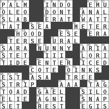 ACROSS 1. Inside of hand 5. _ china 9. Australian flightless bird 12. Margarine 13. Do not 14. Of or related to the anus 15. Thick slice 16. Part of Q.E.F. 17. Electrical Unit 18. Make lace 19. Ocean 21. Distance measurement 22. Parka part 24. Compass dir. 26. Epoch 27. Laconic 28. Mountain range 29. "Two Mules for Sister ____" 30. Pet term 32. Roberta Peters solo 36. Proofreading order 37. One more than two 38. Australian parrot (variant) 39. Event that recurs at intervals 40. Keyboard key 42. On the rocks 43. ____ d'Azur (French Riviera) 44. Pig sounds 46. Eastern Standard Time (abbr.) 49. White ___ sheet 50. Woody plant 51. Long narrow piece of something 53. American Automobile Association (abbr.) 54. Label 57. Frog relative 58. Highlander 61. Grain storage tower 62. Writer Wiesel 63. Hindu god of fire 64. Fastener 65. Put into a specified state 66. Relief 67. The front part of a cuirass DOWN 1. Mail 2. Silent film actress Nazimova 3. Tough but pliablecoriaceous 4. Disorderly crowd 5. The content of cognition 6. And not 7. Heredity factor (abbr.) 8. Baseball player Mel 9. Related on the mother's side 10. Mother 11. Extremist 14. Deep reverence 19. Mayday 20. Paradise 21. Cartoonist voice _ Blanc 23. Speak pompously 24. Bert's buddy 25. Declare 27. Jacques of French films 28. Join together 29. Fast jet (abbr.) 31. National forest in Provo, Utah 32. Place in a line 33. Shooting up abruptly 34. Angers 35. Assist 40. Greek goddess of the dawn 41. Round or rotation of duties 43. Head covering 45. Retirement account (abbr.) 46. _____ Park, CO 47. Fur scarf 48. Distinguishing feature 52. Binary compound 53. Came down and settled, as after flight 55. Jai _ 56. Republicans 58. Slender fish 59. Mature 60. Followers of ems 61. Compass dir.