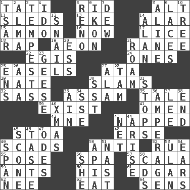 ACROSS 1. Jacques of French films 5. To free from 8. Keyboard modifier key 11. Bobsleighs 13. Make supply last 14. Having or resembling wings 15. ID or VA city 16. Immediately 17. Louse (plural) 18. Strike 19. Period of immesurable duration 21. Indian princess (variant) 22. Armor plate that protects the chest 24. Singles 25. Artist's stands 27. _ moment's notice (2 wds.) 29. Nathan's nickname 30. Shuts with force 32. Backtalk 33. Indian state 35. Lie 39. Be extant 41. Sign of something about to happen 42. Madame (abbr.) 43. Slept 45. Portico 48. Celtic language 49. Heaps 50. Against 52. Sorrow 55. Airs 56. Health resort 57. Any of the three canals of the cochlea 59. Pismires 60. Part of HMS, perhaps 61. _ Allan Poe 62. Born 63. Erode 64. Elected reps. DOWN 1. Russian ruler of old 2. _ mater 3. Storms 4. Wedding promise 5. Former U.S. Attorney General Janet 6. Visual representation of an object 7. Morning condensation 8. Place in a line 9. Shoestrings 10. Relationship diagram 12. Slow-paced one 14. ____ Jay Lerner 20. Curvy letter 21. Wander aimlessly 23. Honkers 25. Followers of ems 26. Auto club (abbr.) 27. Wing 28. Scottish cap 30. Fast jet (abbr.) 31. Discontinues 33. Direct toward a target or goal 34. Compass dir. 36. Electrical Measurement 37. Area sheltered from the wind 38. Conclusion 40. Dec. holiday 43. Fish or hair follower 44. Ascend 45. Biscuitlike quick bread 46. Clothes sense 47. Lyric poems 49. Connect, as a bridge 50. Capital of Western Samoa 51. Political cartoonist Thomas 53. Uhlan (variant) 54. Hearing organs 56. A female animal or person 58. Music discs