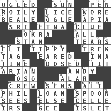 ACROSS 1. Stared at amorously 6. Player for Phoenix 9. Writing instrument 12. Agitated, as a liquid 13. Louse (plural) 14. Had on 15. Memphis, Tenn. Street 16. Stare at amorously 17. Capital of Western Samoa 18. Indian title of respect (Mr.) 19. Inactive volcano in Sicily 20. A slight indication 21. Gumbo ingredient 23. Everything 24. Comedian Laurel of Laurel & Hardy 25. Separates forcefully 28. Connecticut Ivy Leaguer 30. Likely to tip or tilt 34. Long journey 35. Label 36. Having ears or earlike features 38. _ tizzy (2 wds.) 39. Prong on a fork 41. Administered medicine 43. Teat (slang) 44. Believer in; advocate of (suffix) 46. "60 Minutes" Commentator Rooney 48. Bear (Spanish) 49. Having or resembling wings 50. Group working together 51. Elected reps. 53. Keyboard modifier key 56. Silvers or Donahue 57. Grant temporary use of 58. Soup utensil 60. Perceives with the eye 61. Otherwise 62. Cell (Danish) 63. Big collection agency 64. Turn to the right 65. Small island DOWN 1. Globe 2. Moves 3. One who doesn't tell the truth 4. American author Paul (1891-1958) 5. Color 6. Public display of a written message 7. Southern CA. univ. 8. Born 9. Teen's desire 10. One of the Great Lakes 11. Teachers' org. 13. Globular water bottle used in Asia 14. Place for singles 19. Bert's buddy 20. Domesticated feline 22. Krazy ___ of comics 24. Seigniories (variant) 26. Painter Guido (1575-1642) 27. Three-handed card game 28. Singer James 29. Den 31. Groovy apt. 32. Adept person 33. Affirmative reply 37. Allots cards 40. Artist's stands 42. Heredity factor (abbr.) 45. At this time 47. Window treatments 49. Singer Murray 50. "Mermaids" star 51. Not divided or shared with others 52. Comfort 54. Hang loosely or laxly 55. Lacquered or enameled metalware 56. Air pressure measure (abbr.) 57. Part of a journey 58. _-fi 59. Fish or hair follower