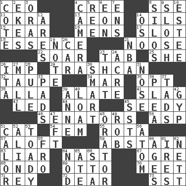 ACROSS 1. Corporate head (abbr.) 4. Algonquian 8. Compass dir. 11. Gumbo ingredient 13. Age 14. Lubricates 15. Pull into pieces 16. Not women's 17. Position in a hierarchy or organization 18. Substance 21. Trap for birds or small mammals 22. Fly high 23. Keyboard key 25. A female animal or person 26. Naughty child 29. File 13 32. Grayish beige 34. Make imperfect 35. Choose 38. Silent film actress Nazimova 39. Having winglike extensions 41. Volcanic refuse 43. Directed 44. And not 45. Shabby and untidy 46. Legislators 50. Viper 51. Domesticated feline 54. Opposite of masc. 55. Roll call or roster of names 57. At or to great height 59. Choose not to consume 63. One who doesn't tell the truth 64. Political cartoonist Thomas 67. Legendary monster 68. Southwest Nigerian state 69. "Beetle Bailey" pooch 70. Rendezvous 71. Marina Del _, California 72. Letter starter 73. Fast jet (abbr.) DOWN 1. ____ d'Azur (French Riviera) 2. Makes supply last 3. Mouths or openings 4. Device for capturing images 5. To sift 6. Period of immesurable duration 7. Followers of ems 8. Grain storage towers 9. Make a splashing sound 10. First name in cosmetics 12. Ancient Greek god of war 14. Bear (Spanish) 19. Brief written record 20. Automobile 21. Basketball assoc. 23. Not this but _ 24. 43,560 square feet 26. Call ___ day 27. Shopping center 28. Whimper 30. Don Adams' spy role 31. Sense of smell 33. Groovy apts. 36. Entreaty 37. Small boys 39. Queen of England 1702-14 40. Rich soil 42. Hustle 45. Fast planes 47. Newt 48. Speaker 49. Director Reiner 51. Bodily heat indicating an inflammation 52. Place in a line 53. Sycophant 56. Smallest unit of an element 58. Back 60. Grows older 61. Angers 62. Remaining after all deductions 64. Dreamland 65. Had dinner 66. R.R. building