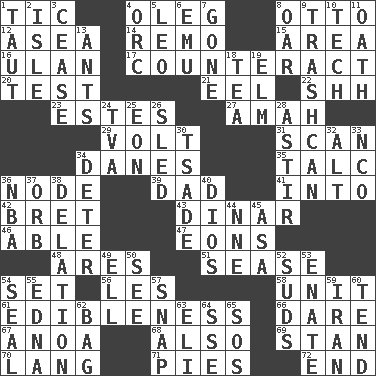 ACROSS 1. Nervous spasm 4. Cassini of fashion 8. "Beetle Bailey" pooch 12. Toward the sea 14. San ____ (Riviera town) 15. Type of rug 16. ____ Bator 17. Act in opposition 20. Trial 21. Snakelike fish 22. Quiet! 23. _____ Park, CO 27. Wet nurse 29. Electrical Unit 31. Skim 34. Natives or inhabitants of Denmark 35. Baby powder 36. Connecting point 39. June honoree 41. To the inside or interior of 42. Cy Young winner Saberhagen 43. Middle Eastern gold or silver currency 46. Competent 47. Immeasurably long periods of time 48. Ancient Greek god of war 51. Gospel singer Marvin 54. Arrange properly for use 56. French article 58. A single undivided whole 61. The property of being fit to eat 66. Have the gumption 67. Small Philippine buffalo 68. In addition 69. Comedian Laurel of Laurel & Hardy 70. Long (Scottish) 71. Sliced desserts 72. Conclude DOWN 1. Tense 2. Capri or Wright 3. Stop 4. The grampus (Milton) 5. Lion 6. Australian flightless bird 7. Went 8. Boat paddle 9. File 13 10. Technical 11. Pledge 13. Pismires 18. Beverage made from leaves 19. Shade tree 24. Federal power corp. 25. Age 26. Downhill vehicle 28. Moving about 30. Sadhe (variant) 32. Keyboard modifier key 33. Non-commissioned officer (abbr.) 34. Prevent from occurring 36. Basketball assoc. 37. Globe 38. Conveyance 40. "Vaya con ____" 44. Compass dir. 45. White ___ sheet 49. Pipe bend 50. Perceive with the eye 52. Beer foam 53. Related on the mother's side 54. Lick closed 55. Pulitzer Prize-winning author Ferber 57. Fastener 59. SW Asia republic 60. Look after 62. Paper or plastic container 63. Connecticut Ivy Leaguer 64. Compass dir. 65. Distress signal