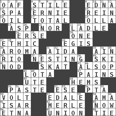 ACROSS 1. Clumsy lout 4. Vertical member of a panel or frame 9. Pulitzer Prize-winning author Ferber 13. Health resort 14. Bert's buddy 15. It's straight from the horse's mouth 16. Petroleum 17. Add up to 18. Water jar 19. Viper 21. Or not 22. Dipping utensil 24. Celtic language 26. Single 27. Moral principle 29. Armor plate that protects the chest 30. Scent 31. Opera by Verdi 33. The 18th letter of the Arabic alphabet 36. _ de Janeiro 37. Snuggling 40. What Jean-Claude Killy likes to do 41. Lower and raise head in agreement 42. Three-handed card game 43. Columnist Joseph or Stewart 45. Globular water bottle used in Asia 47. Aches 48. Shoshoni 49. Is hesitant and indecisive 50. Thick mixture 52. Compass dir. 54. Parent Teacher Association (abbr.) 56. Electrical Unit 57. Peak District village in England 59. Nursemaid (var.) 61. Austrian river, tributary to the Danube 62. Haggard of country music 63. Immediately 64. Inactive volcano in Sicily 65. The state of being joined or united 66. Neckwear DOWN 1. Bear (Spanish) 2. Capital of Western Samoa 3. It jiggles the polygraph 4. Put into a specified state 5. Heavy duty weighing machine 6. To the inside or interior of 7. One who doesn't tell the truth 8. Snakelike fish 9. Eats (away) 10. Small valley 11. Mediterranean tributary 12. Santa ___, CA 20. Demure 22. Utah city north of Ogden 23. Black tropical American cuckoo 25. Examine hastily 27. Merit 28. Musical group of three 29. Prepare for publication 31. "____ silly question..." 32. Call ___ day 33. Helper 34. Visual representation of an object 35. Pinches, bites 38. First name in cosmetics 39. Yawn 44. Desk light 45. A period of five years 46. Baseball player Mel 49. Phone greeting 50. Mail 51. Actor Alda or Thicke 52. Genesis locale 53. Indian skirt 55. Mine, in Marseilles 56. Compete 57. Australian flightless bird 58. Car or cant ending 60. Deep reverence
