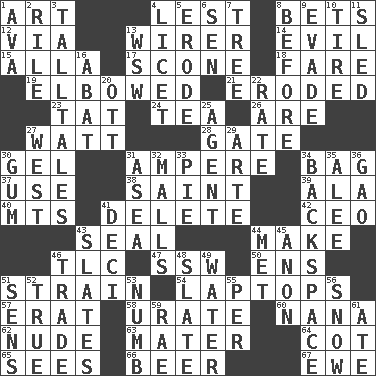 ACROSS 1. Nonscientific branch of learning 4. For fear that 8. Stakes 12. By way of 13. One who wires 14. Tending to cause great harm 15. Silent film actress Nazimova 17. Biscuitlike quick bread 18. Conductor's collection 19. Turned at an angle; bent 21. Worn away 23. Make lace 24. Beverage made from leaves 26. "We ___ not amused" (Victoria) 27. Electrical Unit 28. Yard entry 30. Set 31. Electrical Unit 34. Container for groceries 37. Purpose 38. Virtuous person 39. Chicken ___ king 40. Mountains (abbr.) 41. Erase 42. Corporate head (abbr.) 43. Lick closed 44. Cause to be 46. Affectionate concern, for short 47. Compass dir. 50. Followers of ems 51. Put through a sieve 54. Portable computers 57. Part of Q.E.F. 58. A salt of uric acid 60. Grandmother 62. Unadorned 63. Mother 64. Small bed 65. Perceives with the eye 66. Fermented drink made from hops 67. She-sheep DOWN 1. Actress Gardner 2. Cause heat under the collar 3. Baron Munchausen's specialties 4. It is permitted: Lat. 5. Eat (away) 6. Elected rep. 7. Woody plant 8. Prior to 9. Dodge 10. Become fatigued 11. Downhill vehicle 13. Compass dir. 16. Blind as ____ 20. Baseball player Mel 22. Pace 25. Representative 27. 270 degrees 29. Johnson of "Laugh-In" 30. Chewing product 31. At sea 32. Shopping centers 33. Sliced dessert 34. Keyboard key 35. Toward shelter 36. E Mali city 41. Tenth: prefix 43. Chalkboards 44. Was introduced to 45. Soon (poet.) 46. Buy and sell 48. Schedule 49. Wetness 51. Elected reps. 52. Loyal 53. Unfeeling 55. For each 56. Overwhelm 59. Actress Charlotte 61. Had dinner