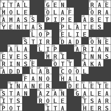 ACROSS 1. Slanted text style (abbr.) 5. Commissioned military rank (abbr.) 8. Actress Charlotte 11. Undercover agent 12. Norwegian king 14. Mouth or opening 15. Collect or gather 17. Corncob 18. Collude with 19. Gossips 21. Food holders 23. Trim (branches) 25. Writer Wiesel 26. Move through with a circular motion 27. Male parent 28. Single 31. In the manner of 33. Mouth edge 35. Believer in; advocate of (suffix) 37. Nights before holidays 38. Medical imaging device (abbr.) 40. Restaurants 41. Remove soap 43. Baseball player Mel 45. Alias (abbr.) 46. Increase 47. Experiment locale 50. Calm and collected 52. Papal veil 53. Actor Linden 54. More empty; more void 56. Keyboard key 61. Comedian Laurel of Laurel & Hardy 62. Muslim summons to prayer 65. An organ shaped like a helmet 66. ___ a Wonderful Life 67. Hero or heavy, e.g. 68. Russian ruler of old 69. Plant holder 70. Call ___ day 71. Possessive pronoun DOWN 1. "If ____ say so..." 2. Heavy book 3. ____ Jay Lerner 4. For fear that 5. Grand Old Party 6. Biblical high priest 7. Slept 8. Loose flowing garment 9. Ancient Greek god of war 10. Consume 13. Chap (slang) 16. Table seasoning 18. Had dinner 20. Earth 22. Opera by Verdi 24. Demure 26. Backtalk 28. Pig sound 29. Nanny 30. Followers of ems 31. Enthusiastic 32. Grant temporary use of 34. Adept person 36. Monetary unit of Yemen 37. Period 39. Hankering 42. Enthusiasm 44. Frog relative 48. Approach 49. Russian wolfhound 51. Cassini of fashion 52. Air blower 54. "Tell ____ the Marines!" 55. Political cartoonist Thomas 57. Thin strip of wood or metal 58. Otherwise 59. Pull apart 60. Hearing organs 61. Small drink 63. Keyboard modifier key 64. Teachers' org.