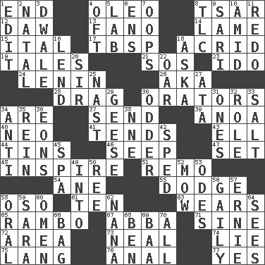 ACROSS 1. Conclusion 4. Margarine 8. Russian ruler of old 12. Obsolete 13. Papal veil 14. Unable to walk 15. Slanted text style (abbr.) 17. Cook's measure (abbr.) 18. Bitter 19. Stories 21. Distress signal 23. Wedding promise 24. Soviet premier 1918-24 26. Alias (abbr.) 28. To be drawn or hauled along 30. Speakers 34. "We ___ not amused" (Victoria) 37. Transmit 39. Small Philippine buffalo 40. Modern: prefix 41. Is inclined (to) 43. Pipe bend 44. Airtight sealed metal containers 46. Ooze 47. Arrange properly for use 48. Stimulate to action 51. San ____ (Riviera town) 54. A saturated hydrocarbon 55. Evade 58. Bear (Spanish) 61. "___ Little Indians" 63. Erodes 65. Role for Stallone 67. Swedish rock group 71. Trig term 72. Type of rug 73. Be tempered by heat 74. Falsehood 75. Long (Scottish) 76. Of or related to the anus 77. Affirmative reply DOWN 1. Prepare for publication 2. Relating to or accompanying birth 3. A sleeping potion; an opiate (poet.) 4. Often (poetically) 5. Experiment locale 6. Followers of ems 7. I made a mistake 8. Affectionate concern, for short 9. Indian skirt 10. Among 11. Make new 16. Grant temporary use of 18. "____ silly question..." 20. Title for a knight 22. Rowing implement 25. Political cartoonist Thomas 27. _ moment's notice (2 wds.) 29. Honkers 30. More peculiar 31. Washington bills 32. Hero or heavy, e.g. 33. Table seasoning 34. Against 35. It's straight from the horse's mouth 36. Immeasurably long periods of time 38. Compass dir. 42. Hurried 45. Health resort 49. To the inside or interior of 50. Portuguese money of account (variant) 52. Cut the grass 53. Lyric poems 56. Lightheartedly 57. Bert's buddy 58. Relating to the mouth 59. "Two Mules for Sister ____" 60. Sign of things to come 62. Nanny 64. Perceives with the eye 66. Paper or plastic container 68. Benjamin's nick name 69. Sound made by sheep 70. Everything