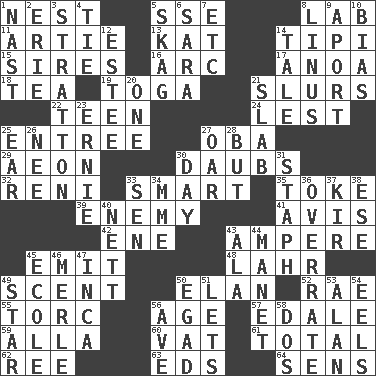 ACROSS 1. Egg locale 5. Compass dir. 8. Experiment locale 11. Nick name for Arthur 13. Krazy ___ of comics 14. Native american tent (variation) 15. Fathers 16. Curve 17. Small Philippine buffalo 18. Afternoon social gathering 19. Ancient Roman robe 21. Runs notes together 22. Adolescent 24. For fear that 25. Main course 27. Chief or king in Benin or Nigeria 29. A really long time 30. Applies to a surface 32. Painter Guido (1575-1642) 33. Don Adams' spy role 35. Puff or smoke 39. Foe 41. Advice 42. Compass dir. 43. Electrical Unit 45. Give off 48. Cowardly lion portrayer 49. Aroma 50. Liveliness 52. Actress Charlotte 55. Torque (variant) 56. Ripen 57. Peak District village in England 59. Silent film actress Nazimova 60. Large container 61. "_____ Recall" 62. To riddle 63. Begley and Asner 64. Elected reps. DOWN 1. Political cartoonist Thomas 2. 4th largest of the Great Lakes 3. Ski resort town in Vermont 4. Standoff 5. Heroin 6. "Two Mules for Sister ____" 7. And so on (abbr.) 8. "_ and Lucy" (Charlie Brown theme song) 9. To the left, to Queeg 10. Prejudice 12. First name in cosmetics 14. Falsehood 20. Single 21. Broad, flat, thick piece 23. Bert's buddy 25. Hearing organ 26. Born 27. Boat paddle 28. With the exception that 30. 24 hours 31. Staphylococcus 33. Elected rep. 34. Madame (abbr.) 36. Make much ado about nothing 37. Apertif with cassis 38. Compass dir. 40. Remaining after all deductions 43. Insect wing 44. French painter Edouard 45. Learning spot: Fr. 46. Haggard of country music 47. South American Indian 49. Play the lead 50. Mild oath 51. Allows 53. ____ Jay Lerner 54. Snakelike fish 56. "___ Maria" 58. Two (Sp.)